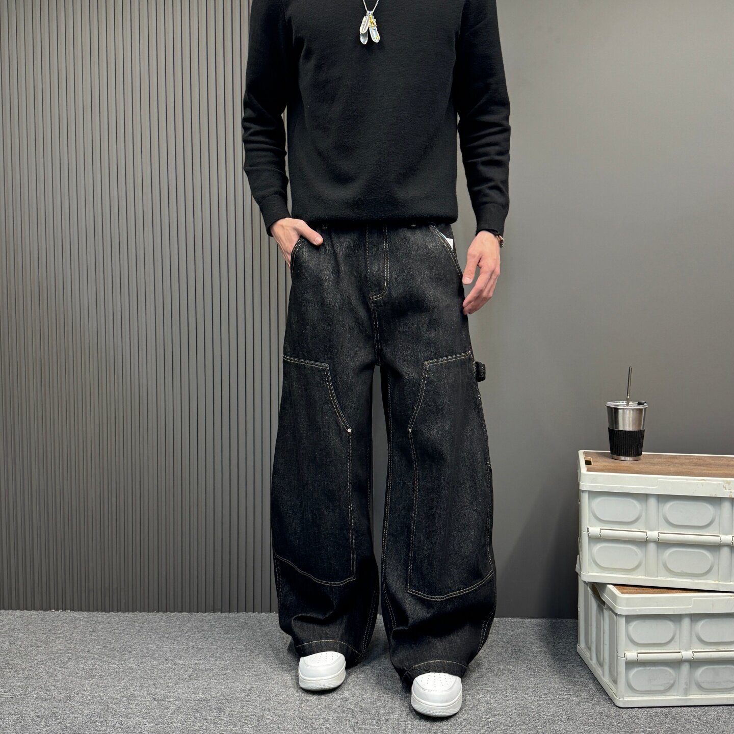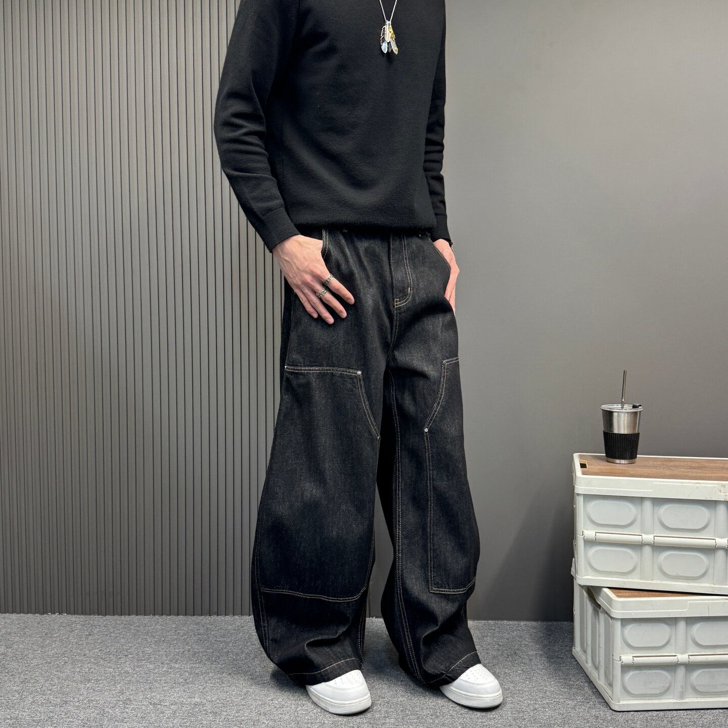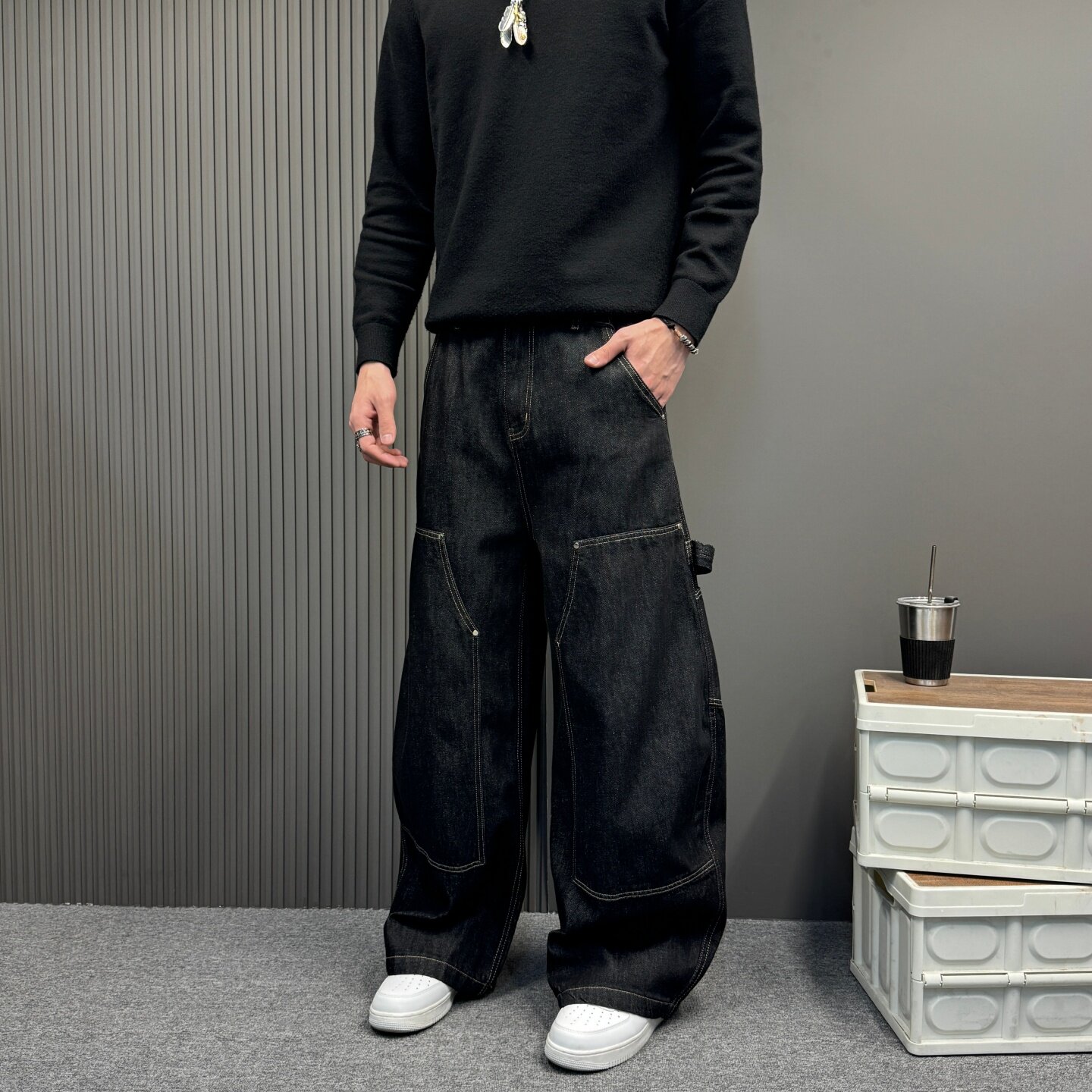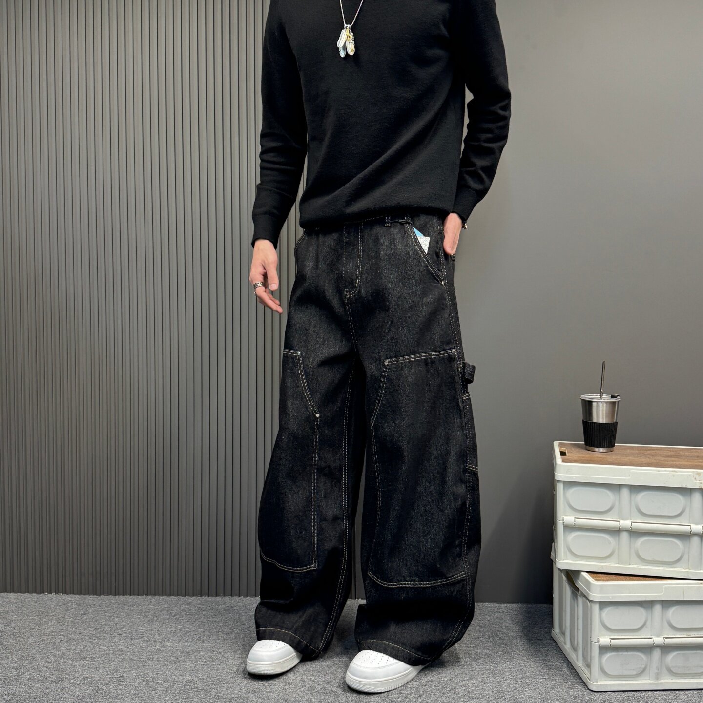 复古丹宁黑拼接牛仔裤男款赤耳丹宁直筒宽松美式潮牌春季弯刀男裤