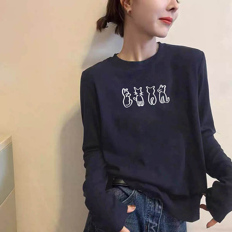 圆领宽松长袖女正肩T恤春秋冬磨毛内搭藏蓝色打底衫欧货纯棉上衣