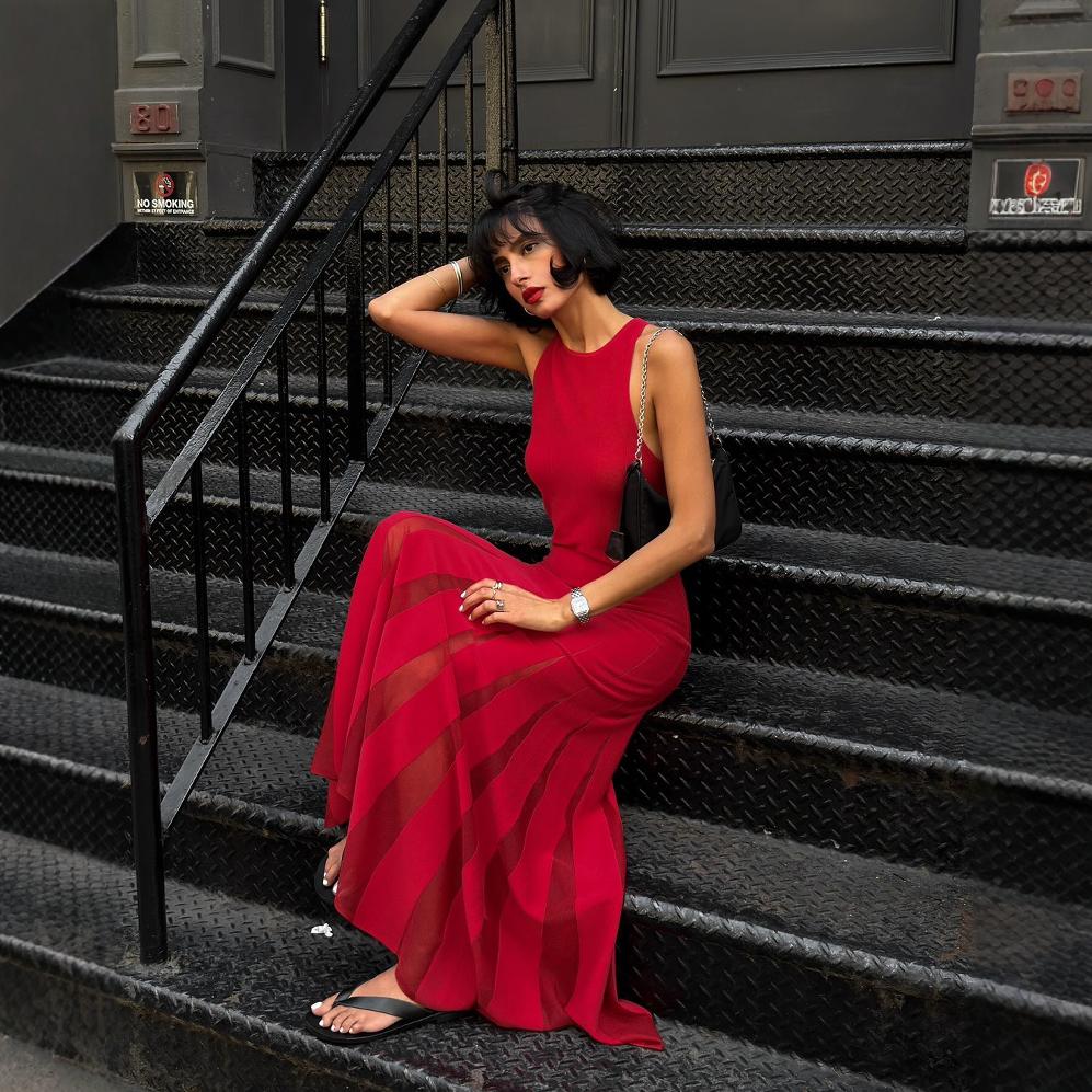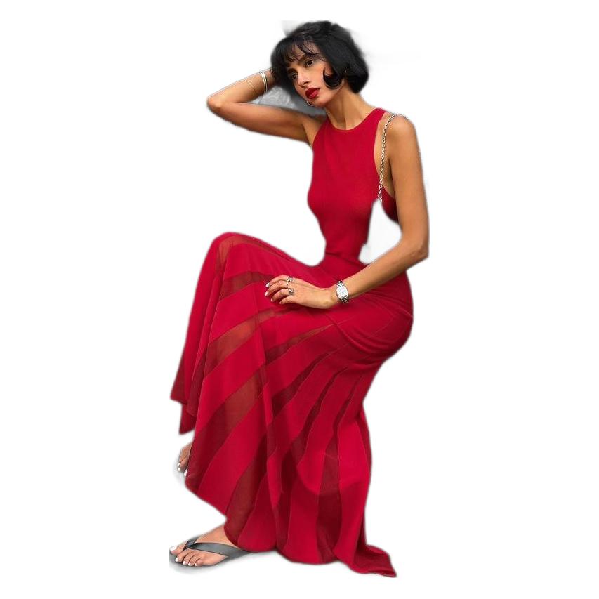 2024夏季欧美亚马逊外贸无袖压褶休闲气质长裙连衣裙毛呢外套