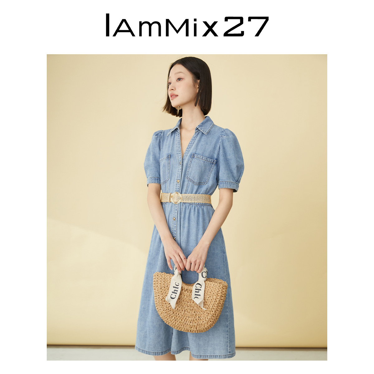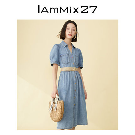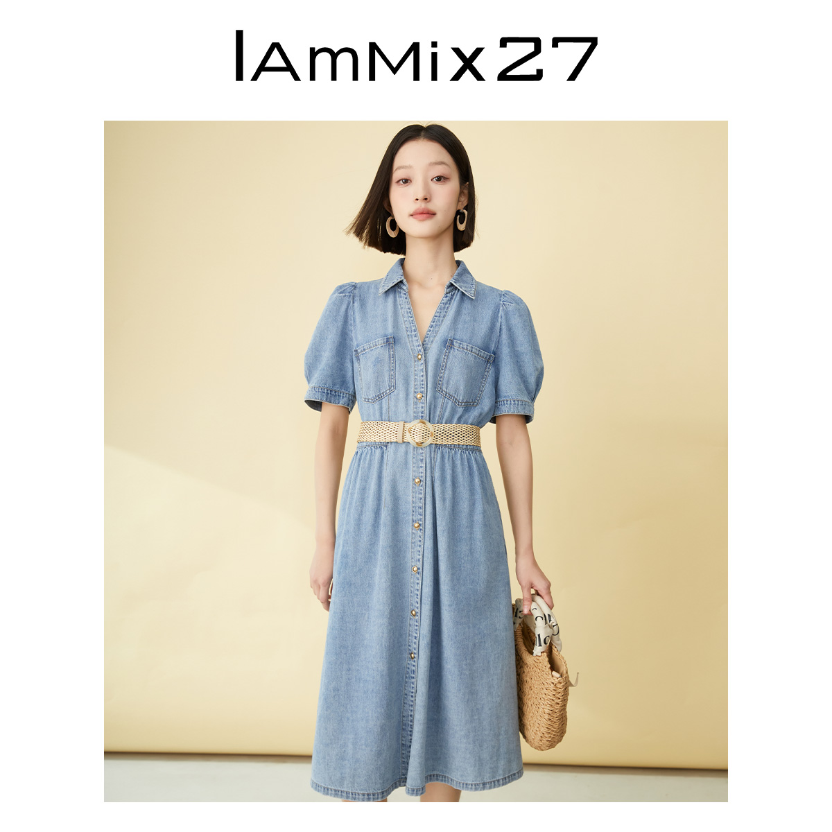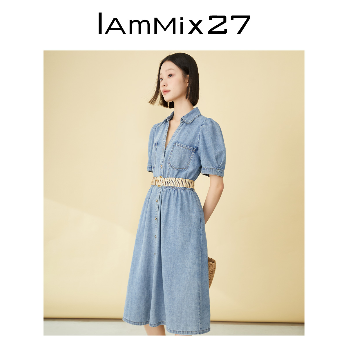 IAmMIX27夏季牛仔连衣裙女法式简约收腰显瘦全棉水洗中长款衬衫裙