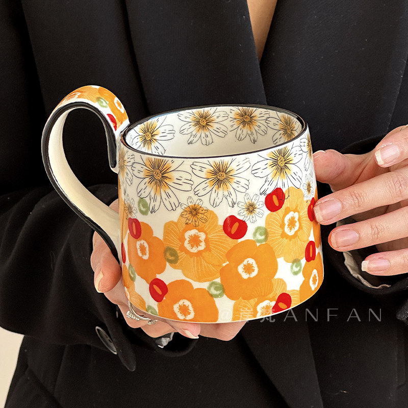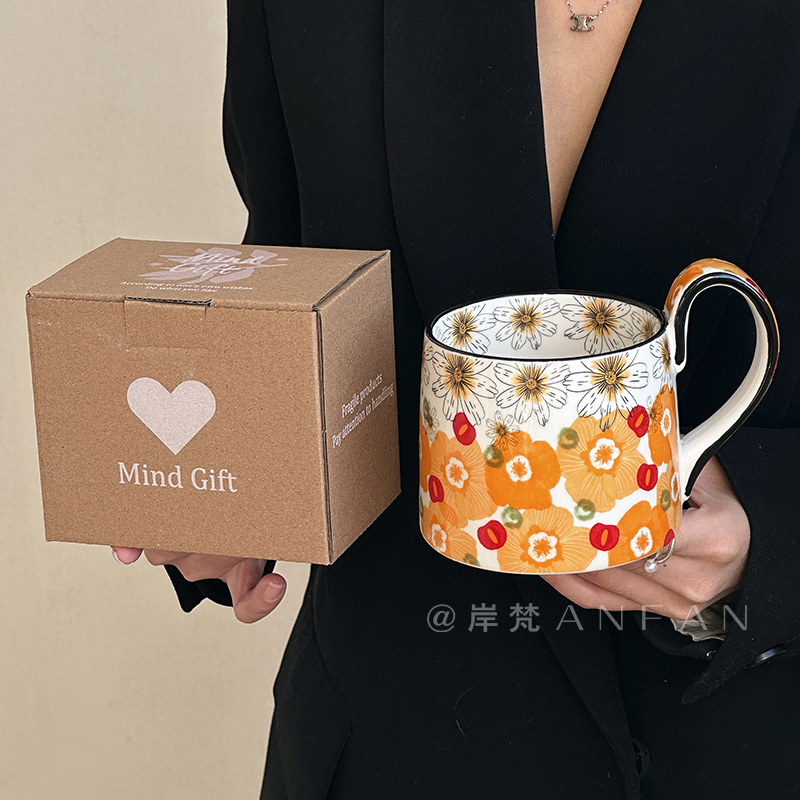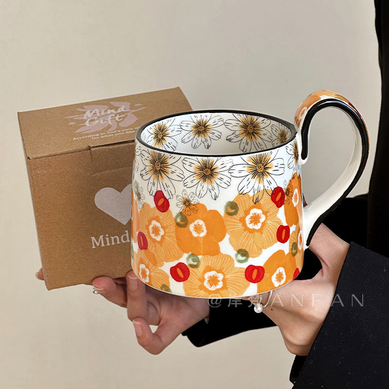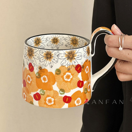 岸梵*复古手绘花朵马克杯陶瓷水杯咖啡杯子高颜值女小众原创礼物