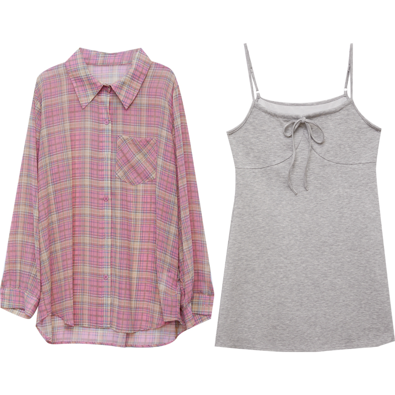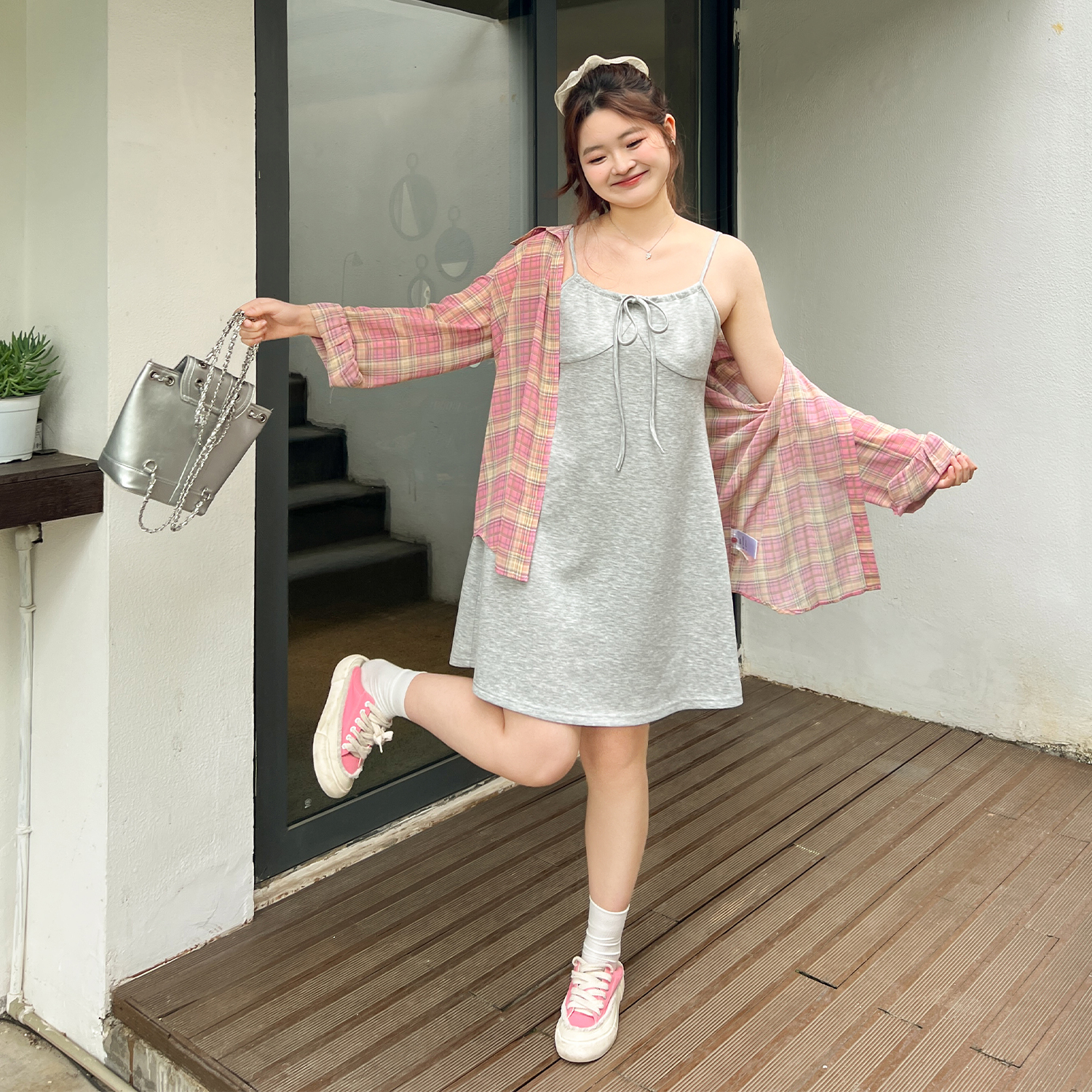 DM100大码百分百2025夏新款女装格子衬衫搭配直筒吊带裙慵懒套装