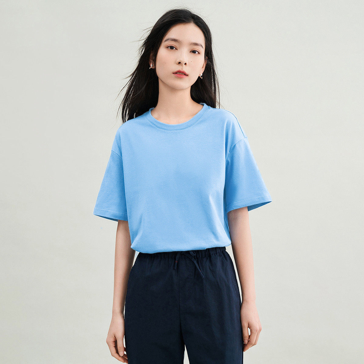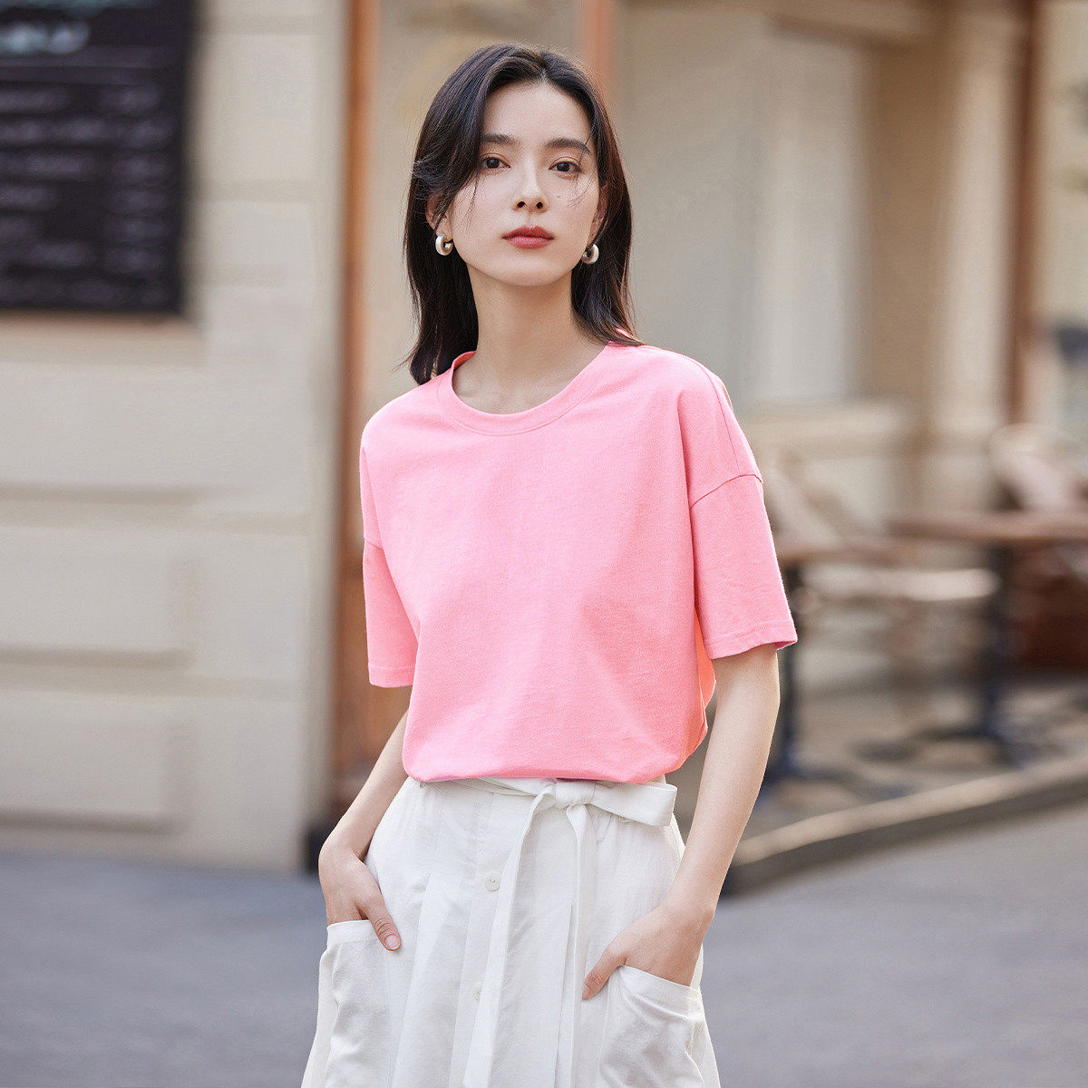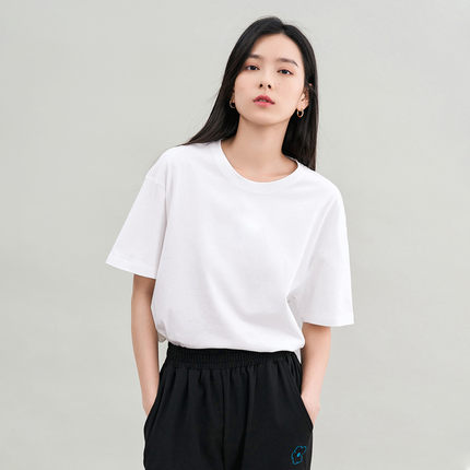 茵曼2026夏季新款纯棉落肩短袖T恤女圆领宽松版百搭显瘦上衣白色
