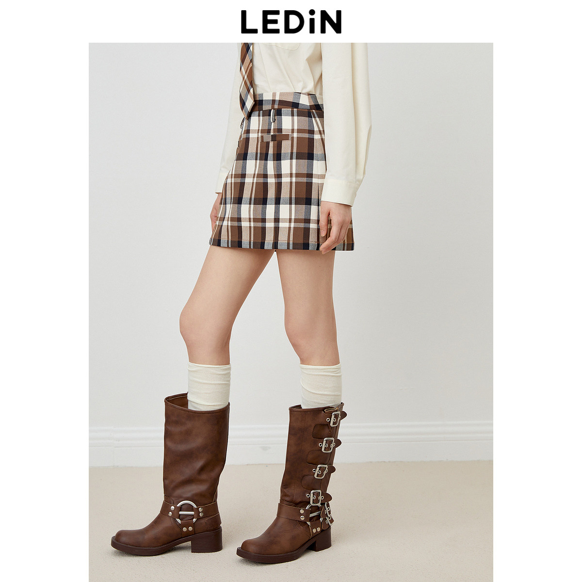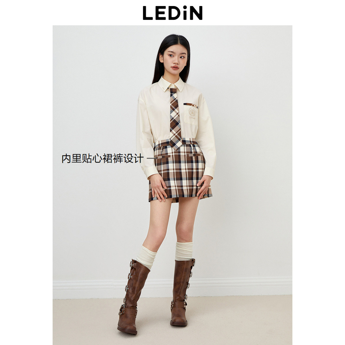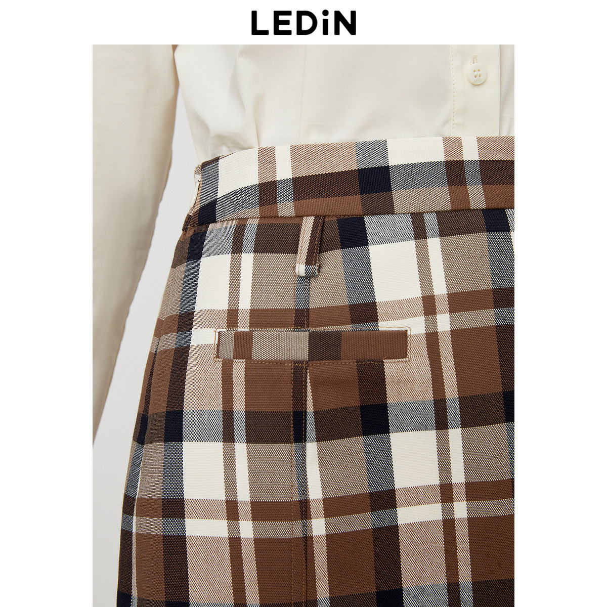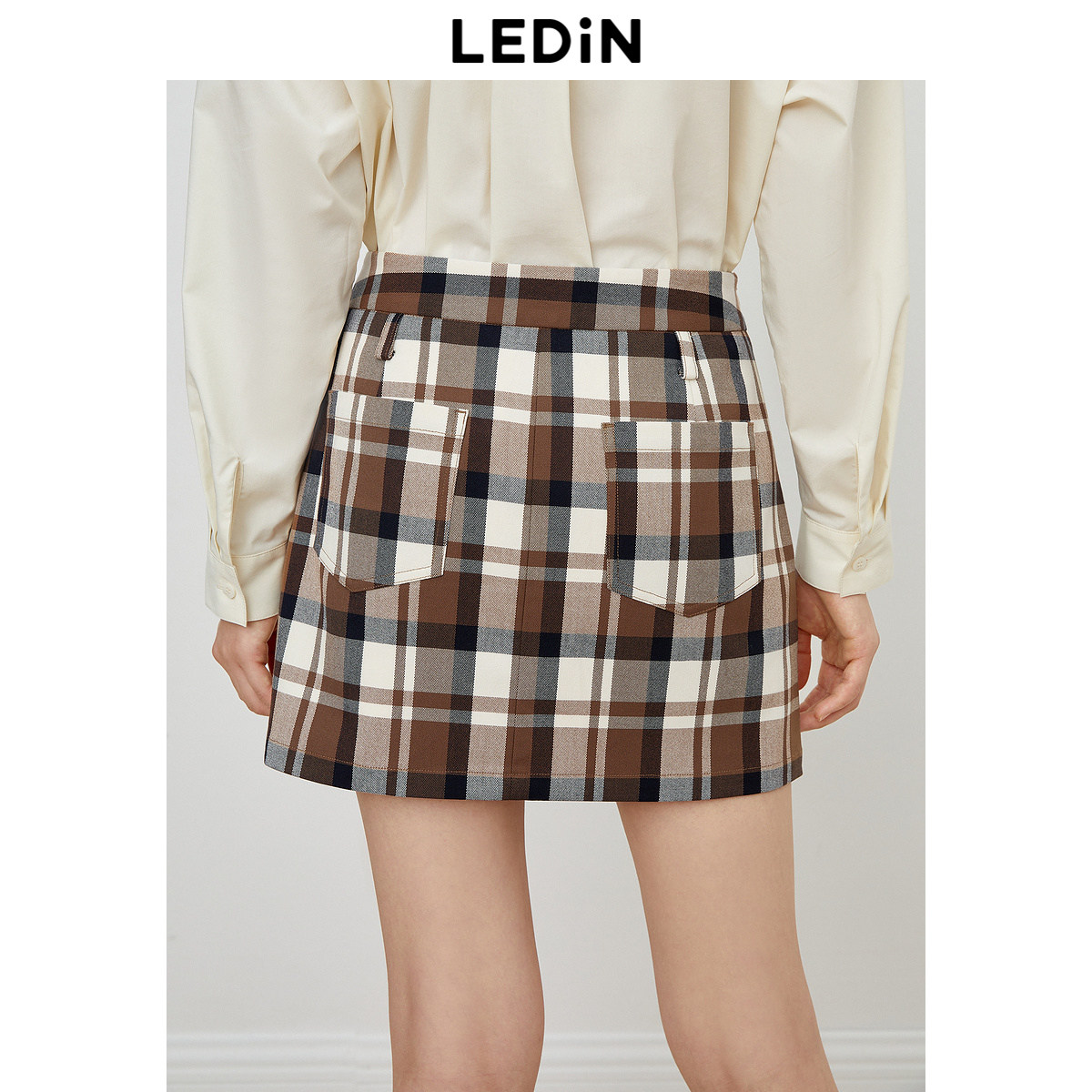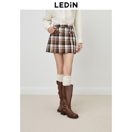 【清仓】乐町学院风半身裙秋季咖色格纹短裙女装简约时尚方块裙