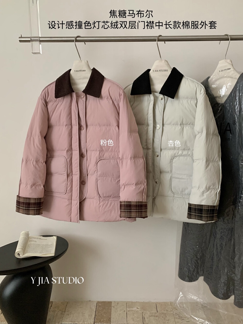 Y.JIA 伊嘉焦糖马布尔设计感撞色灯芯绒双层门襟中长款棉服外套女