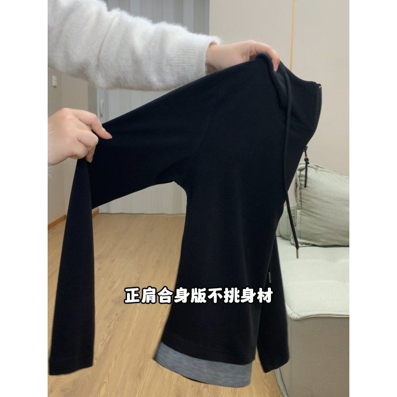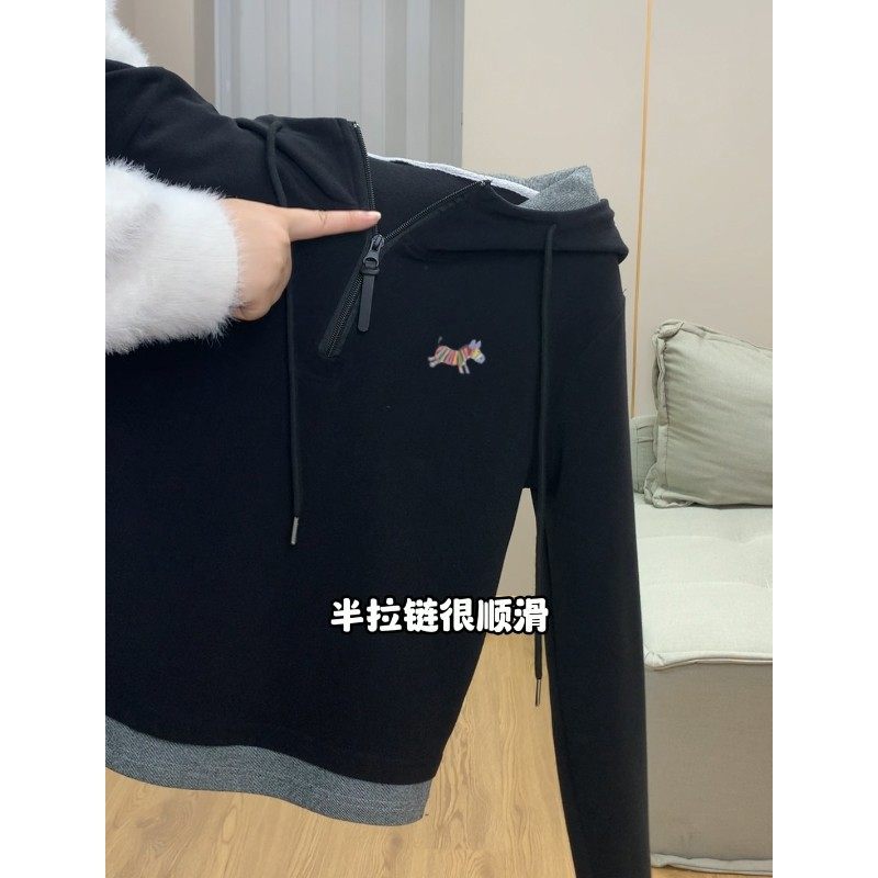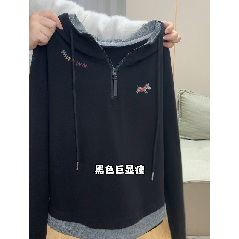 奥特莱斯~清仓捡漏纯棉半拉链连帽假两件卫衣女遮肉显瘦长袖上衣