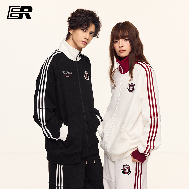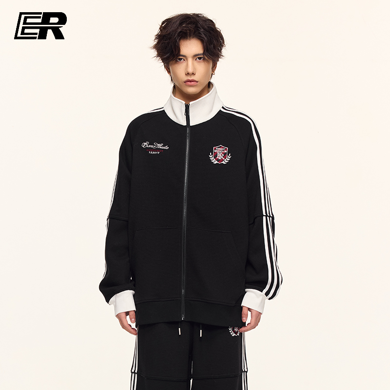 ER撞色条纹立领开衫卫衣男春秋美式潮牌休闲运动学生运动服外套
