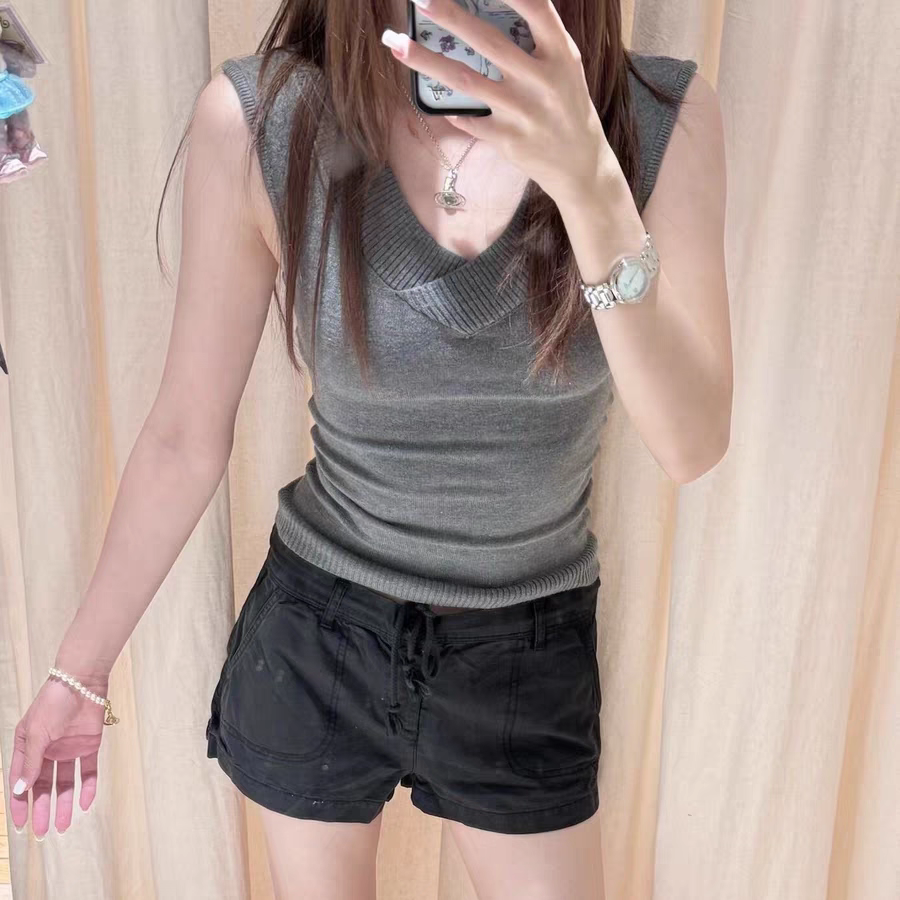 BrandyGirl美式复古交叉V领无袖bm针织背心女修身辣妹打底衫上衣