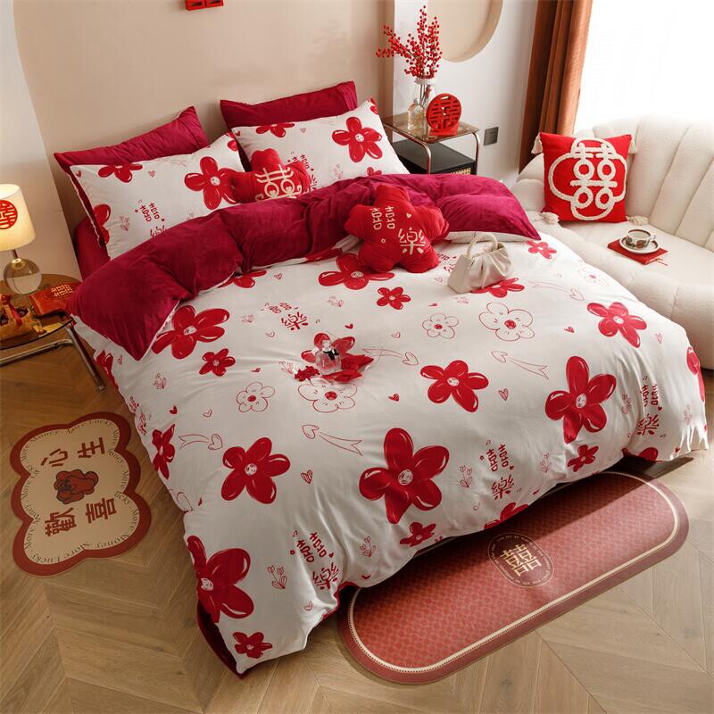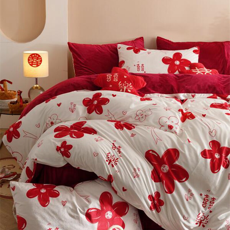 婚庆牛奶绒四件套结婚大红色珊瑚绒床上用品婚嫁法兰绒喜被套床单