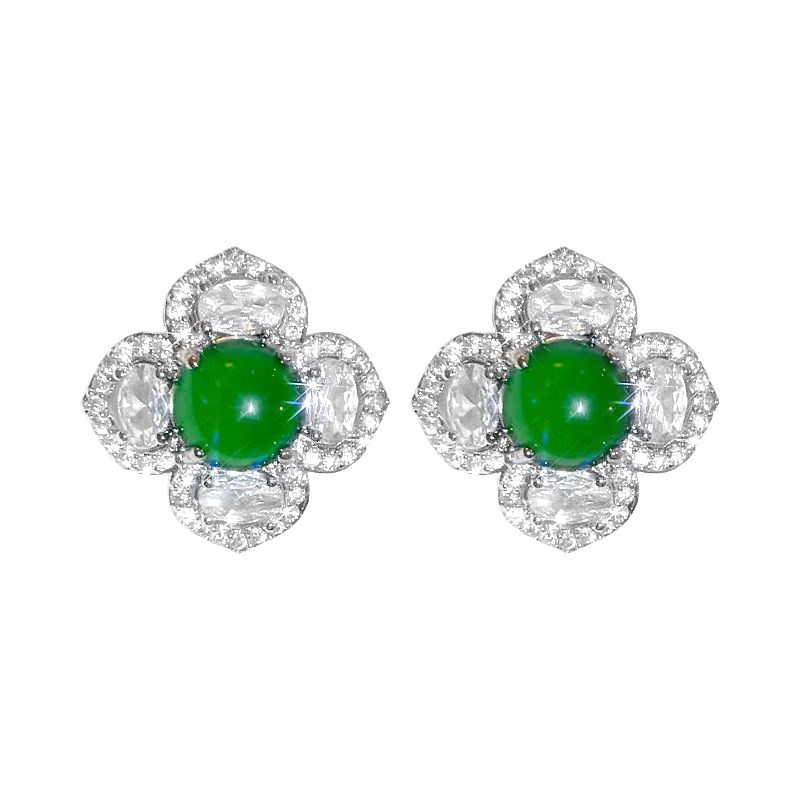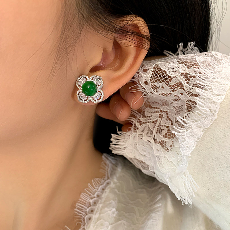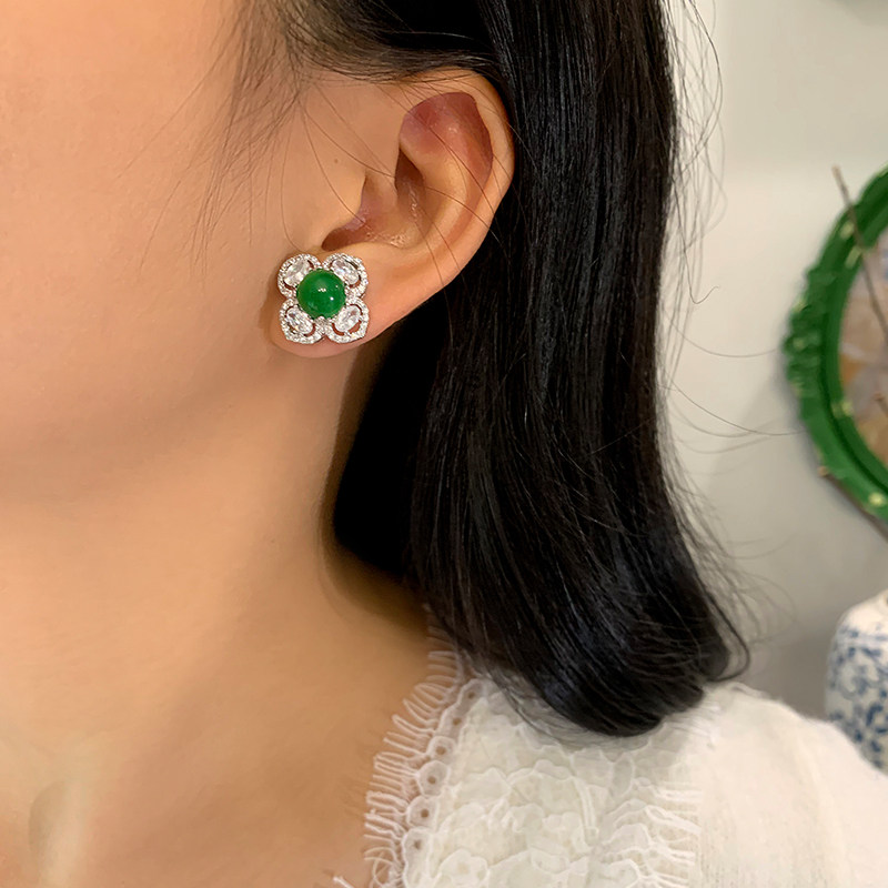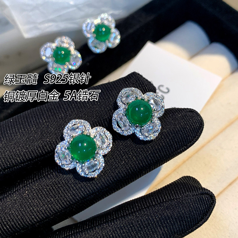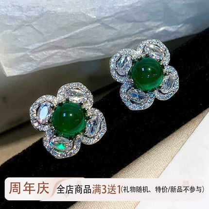 珠宝祖母绿耳钉女纯银针蛋面翡翠花朵耳环小众高级四叶草耳饰国风