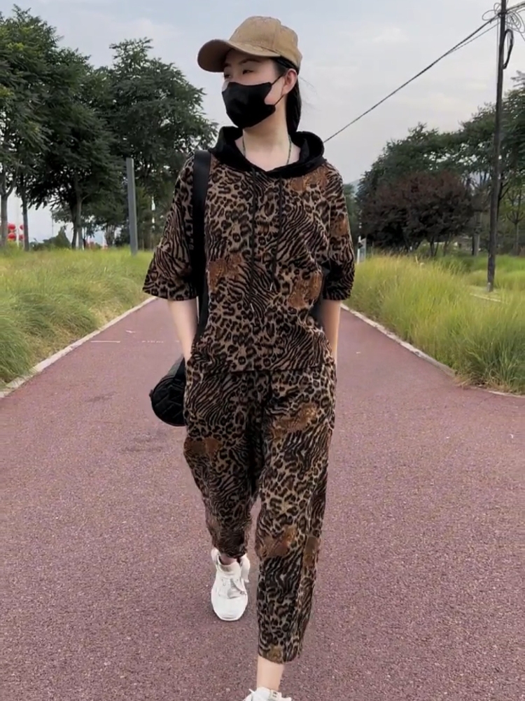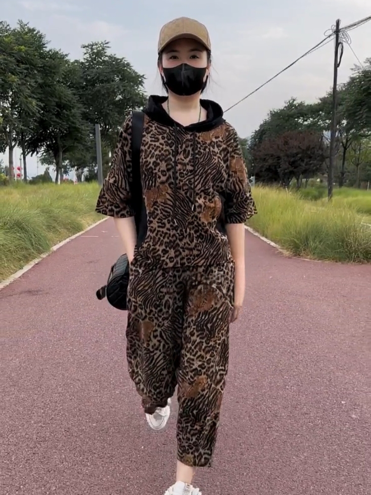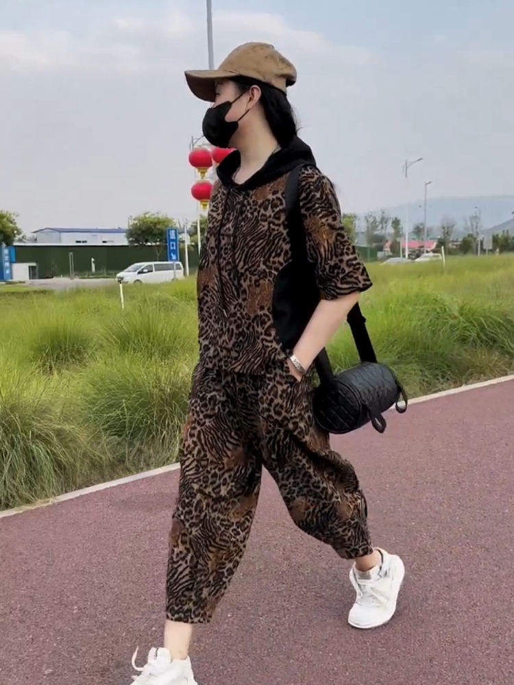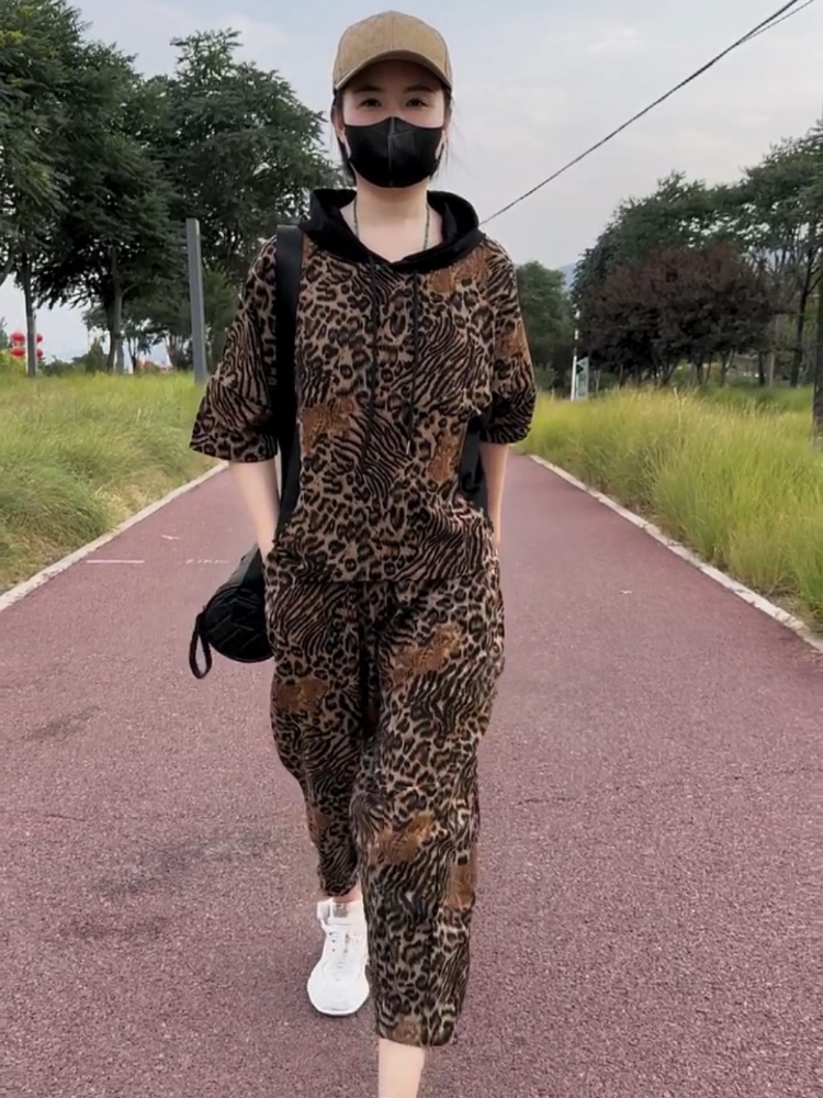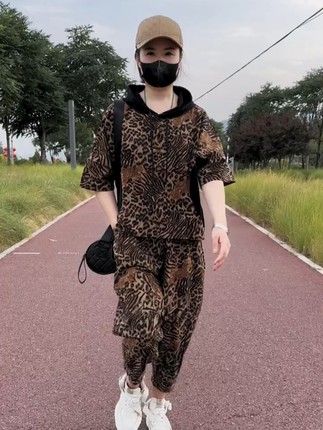 2025夏季新款减龄时尚豹纹休闲套装显瘦短袖上衣九分哈伦阔腿裤潮