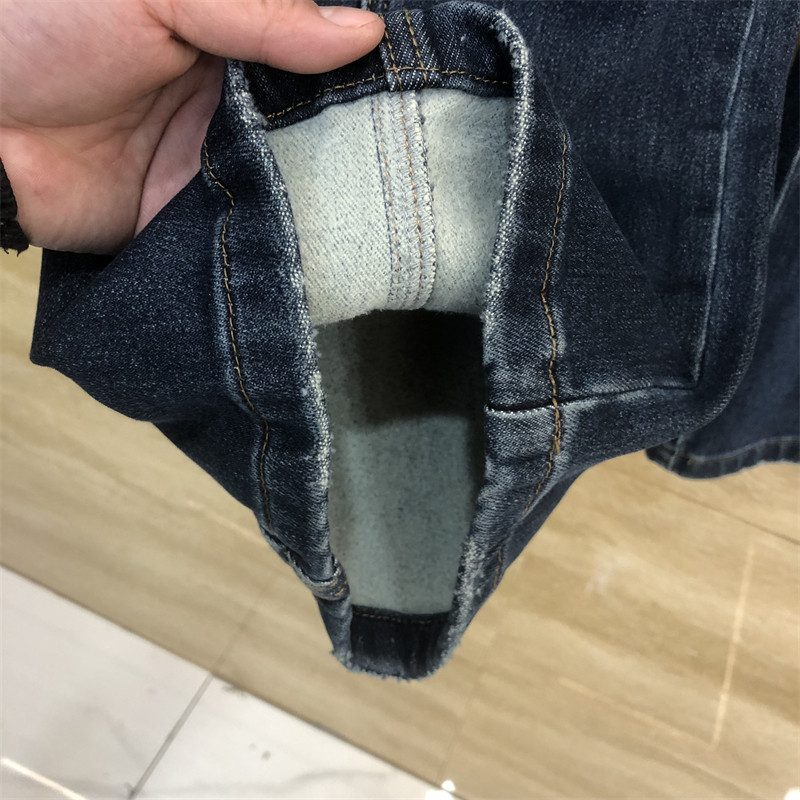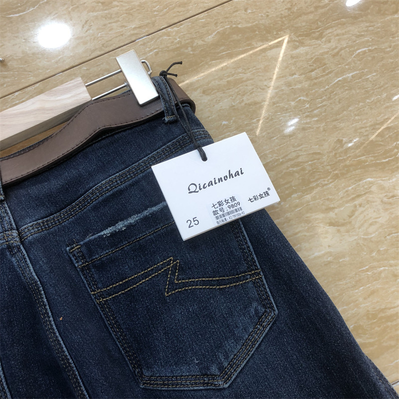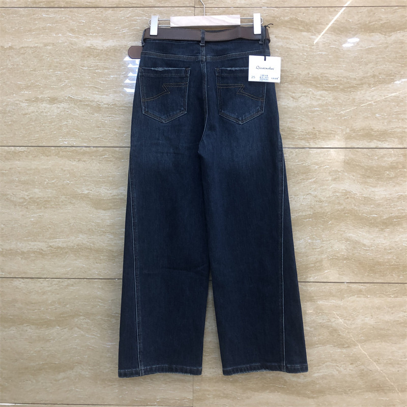 欧洲站七彩女孩9809牛仔蓝斜边杠条设计直筒宽松磨毛牛仔裤女冬款