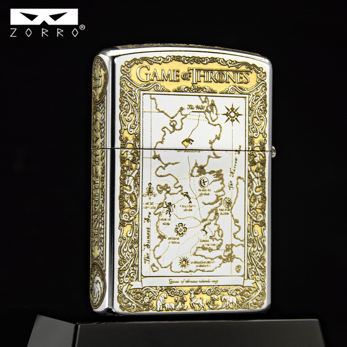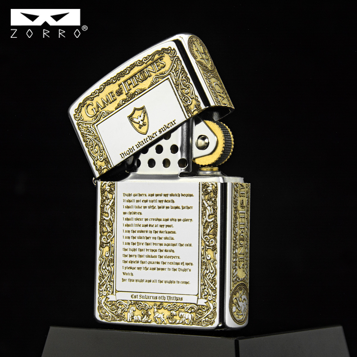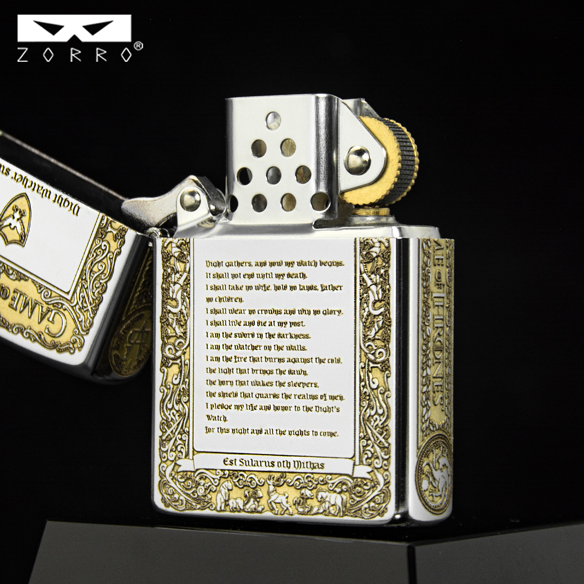 zorro佐罗正品煤油打火机砂轮防风纯铜二代银色雕刻冰与火之歌款