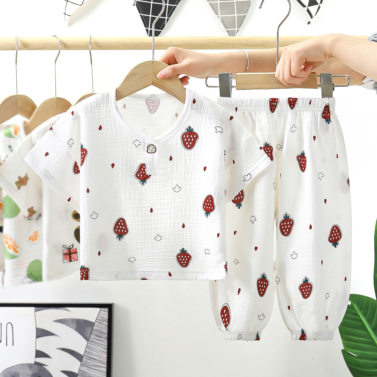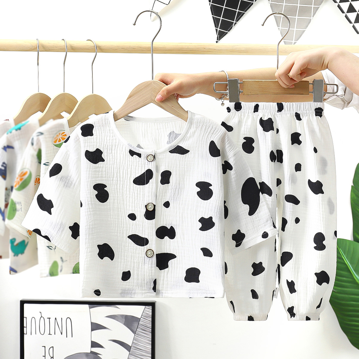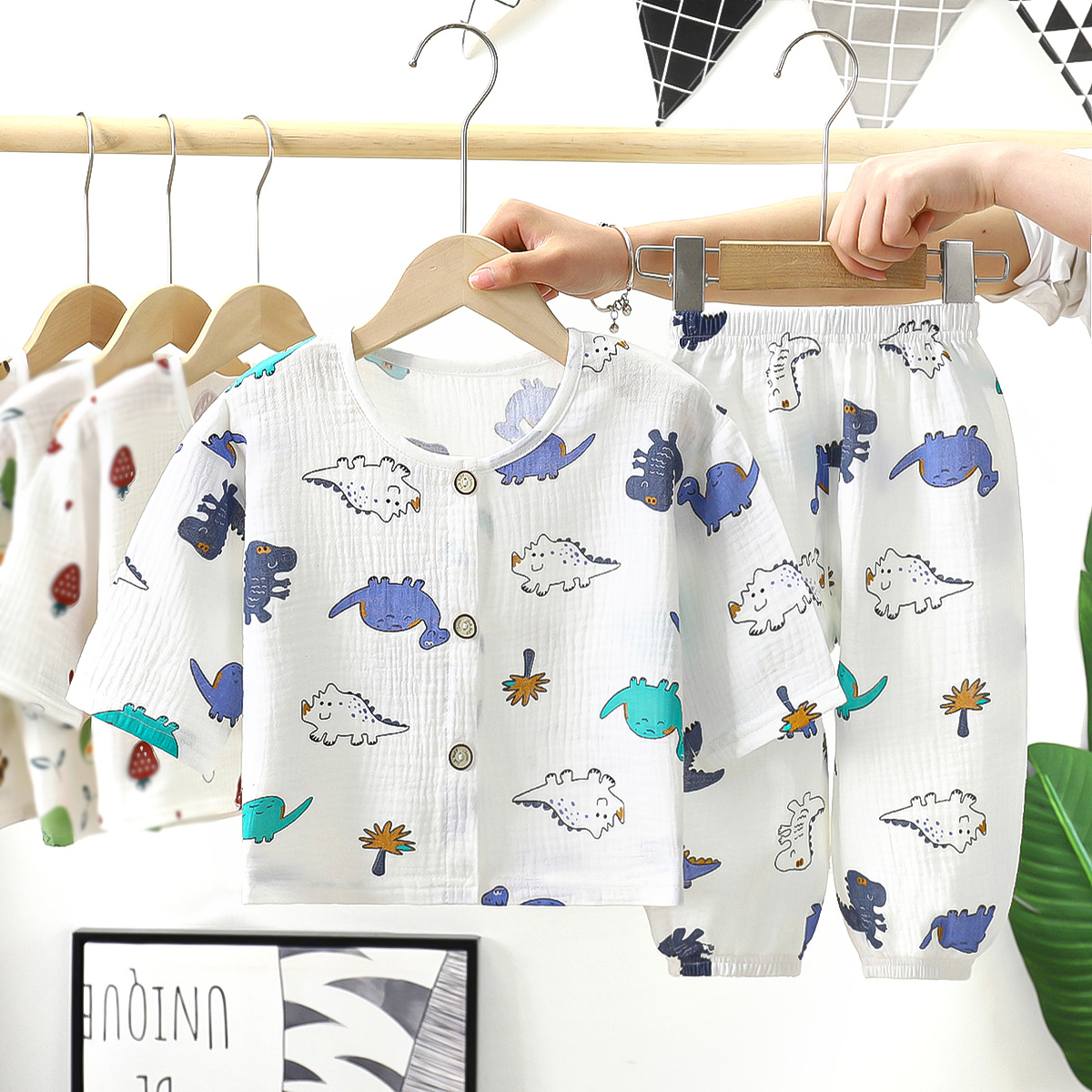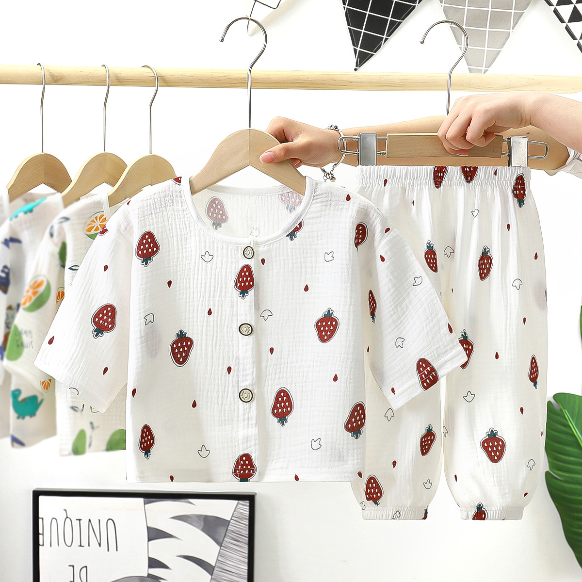 儿童纯棉纱布双层睡衣春夏薄款套装长袖空调服男女童小宝宝家居服
