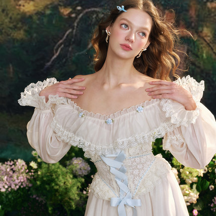 LaceMade 蓝绣球 法式仙女裙一字肩白色长款连衣裙蕾丝鱼骨裙长袖