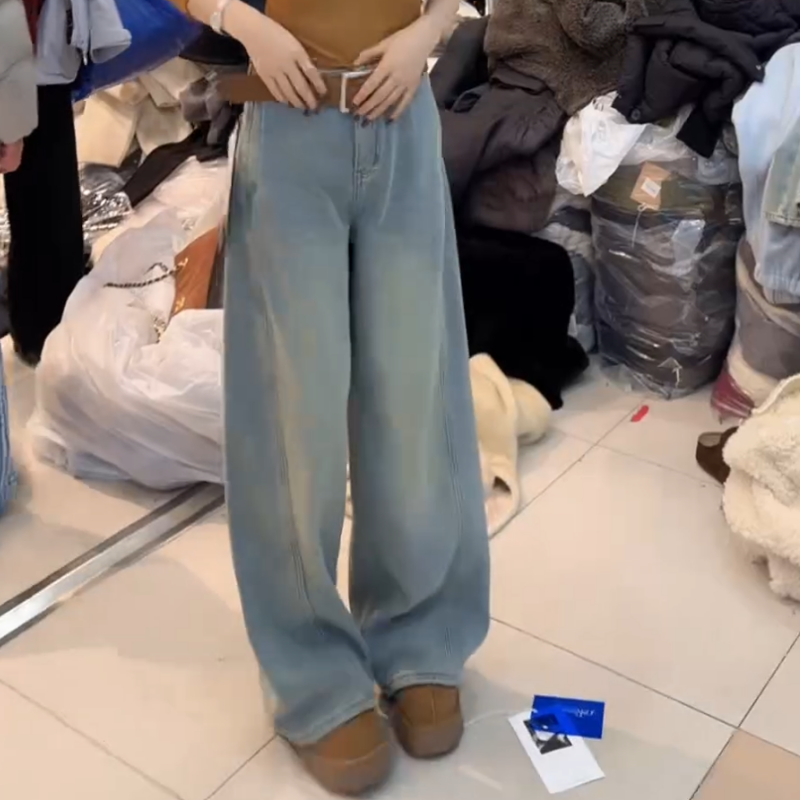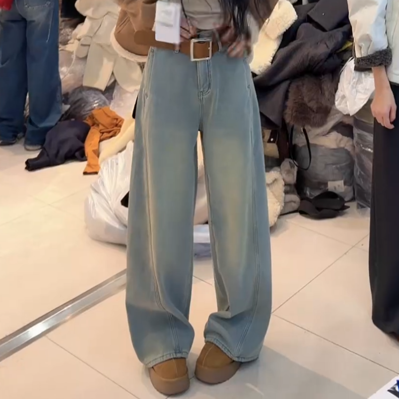 2025秋冬新款水洗牛仔裤高腰休闲风显瘦微弹直筒阔腿拖地长裤子女