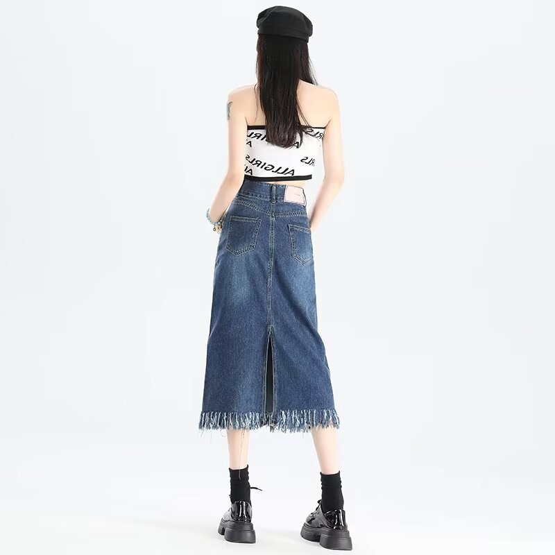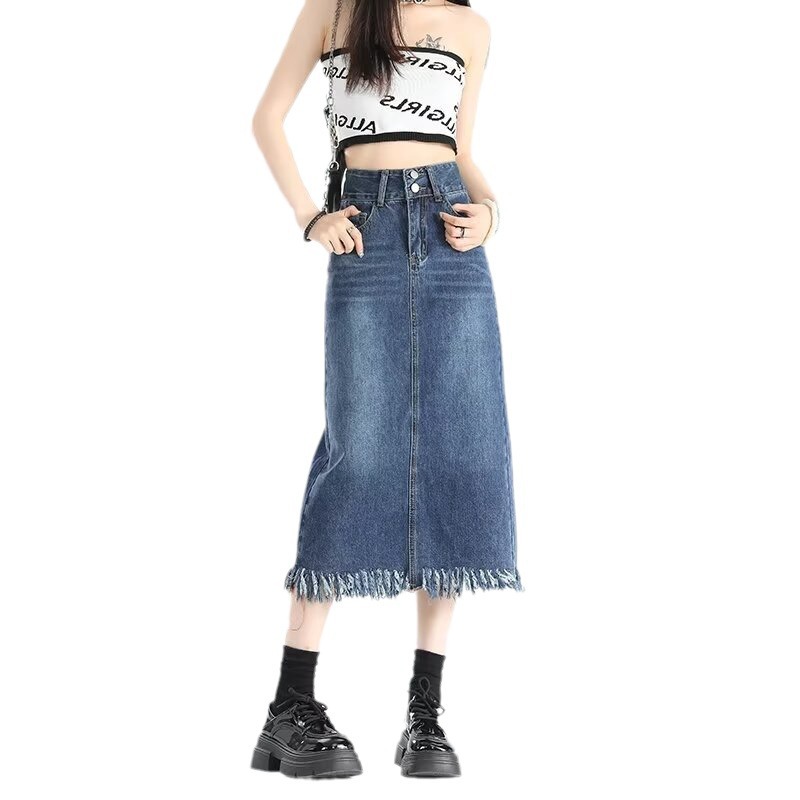 复古高腰牛仔半身裙女夏季新款高腰显瘦流苏设计感中长款a字半裙