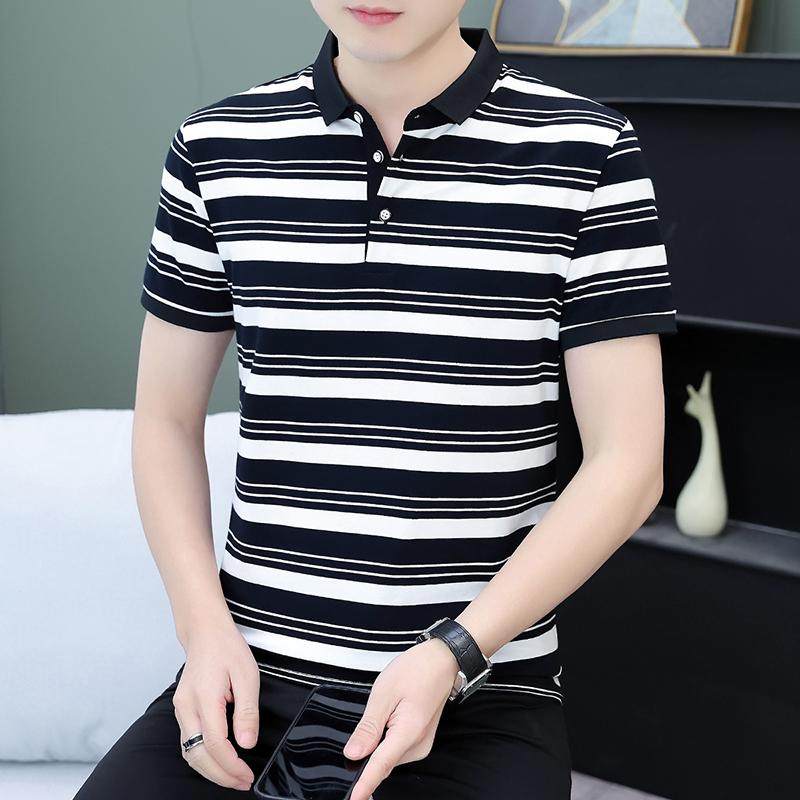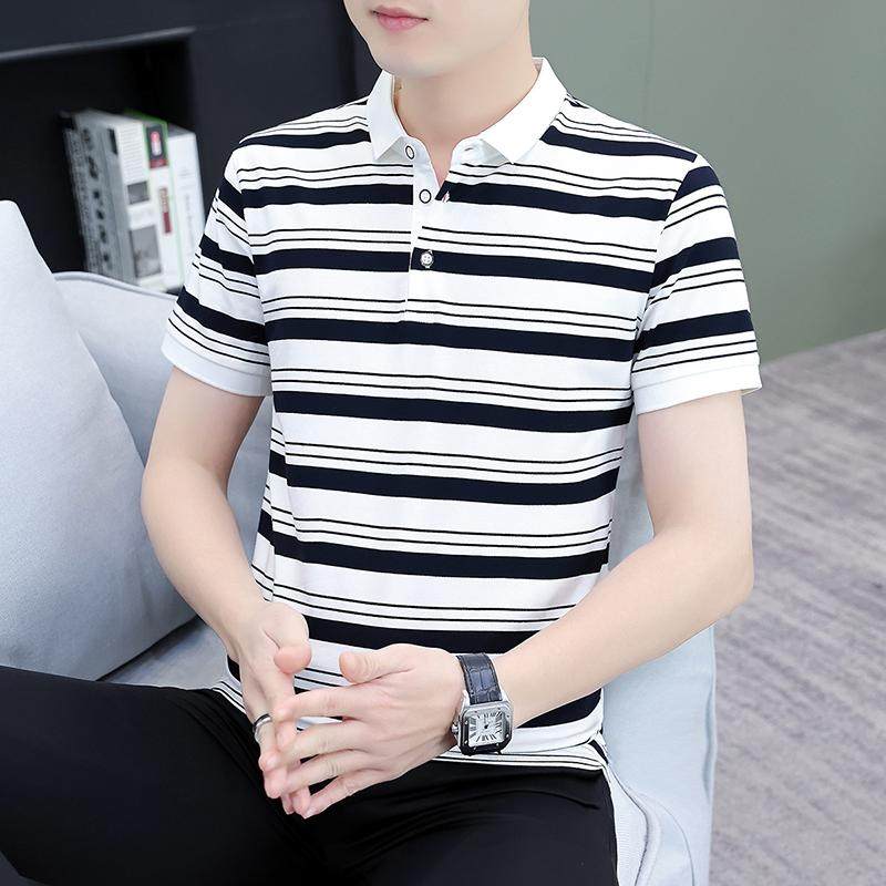 男士翻领短袖T恤条纹纯棉夏季新款透气薄款半袖上衣服修身polo衫