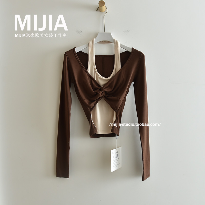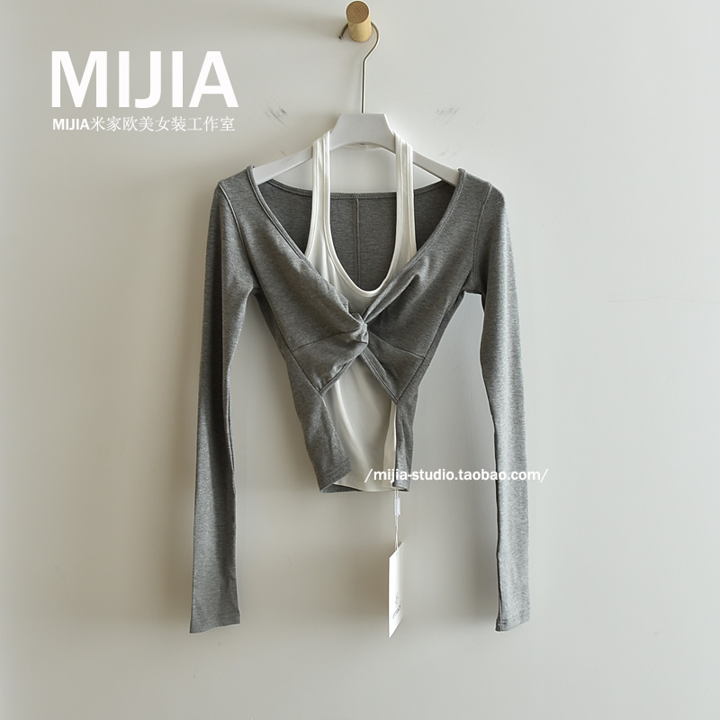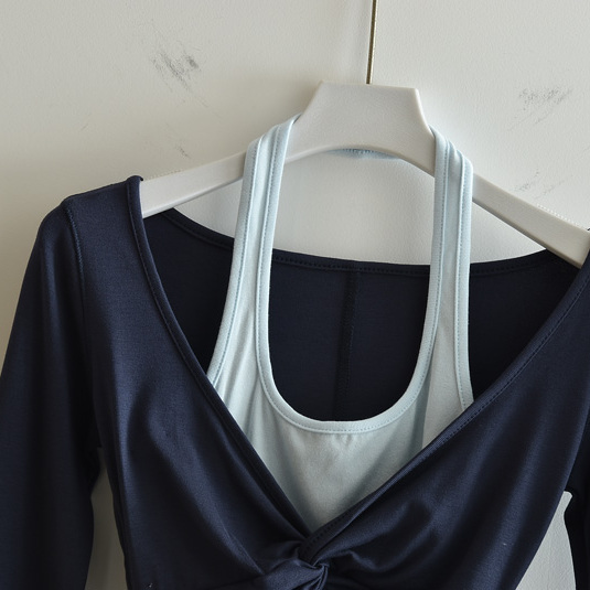 挂脖长袖T恤女假两件短款打底衫