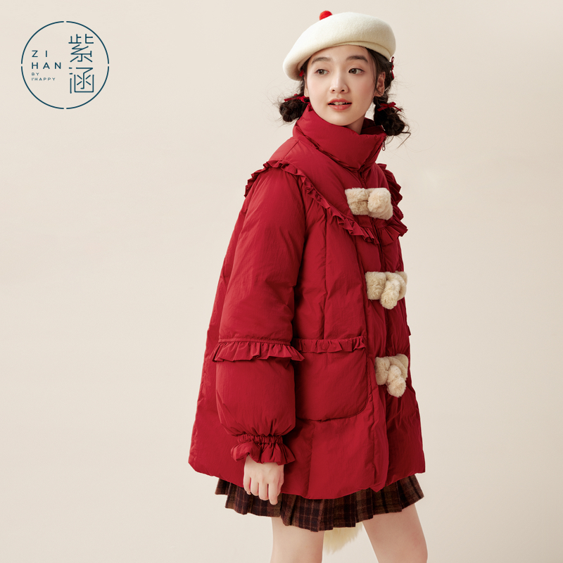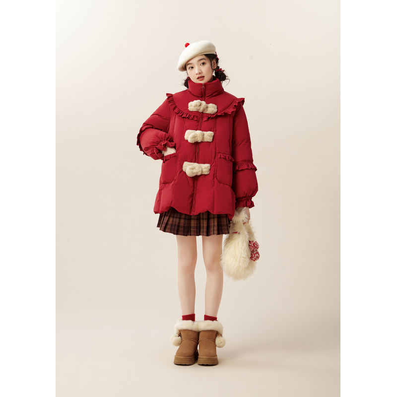 紫涵立领木耳边毛绒盘扣红色羽绒服女冬季新款甜美宽松白鸭绒外套