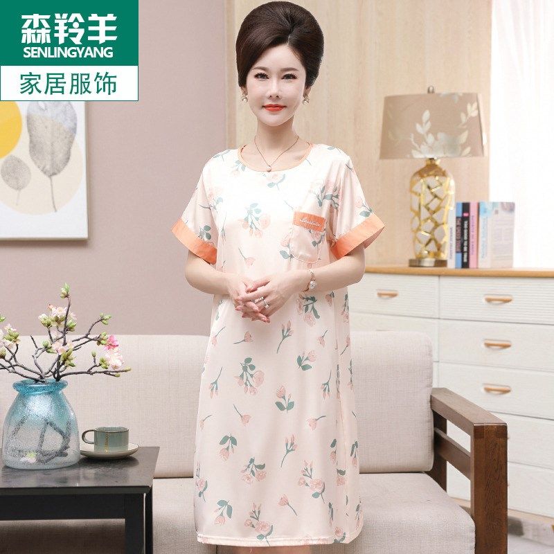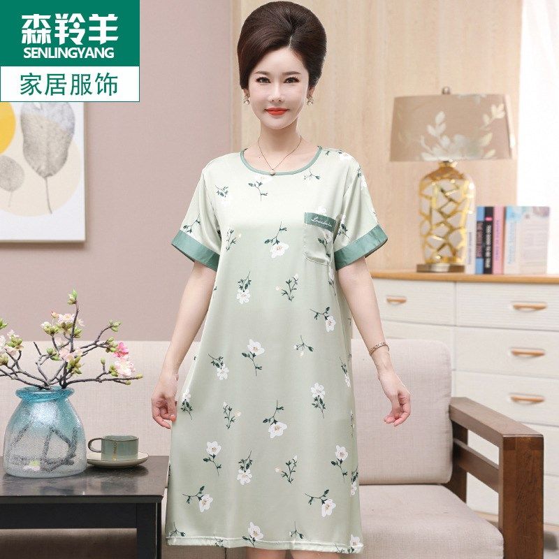 妈妈夏季睡裙女冰丝睡衣丝绸薄款短袖中年圆领家居服连衣裙可外穿
