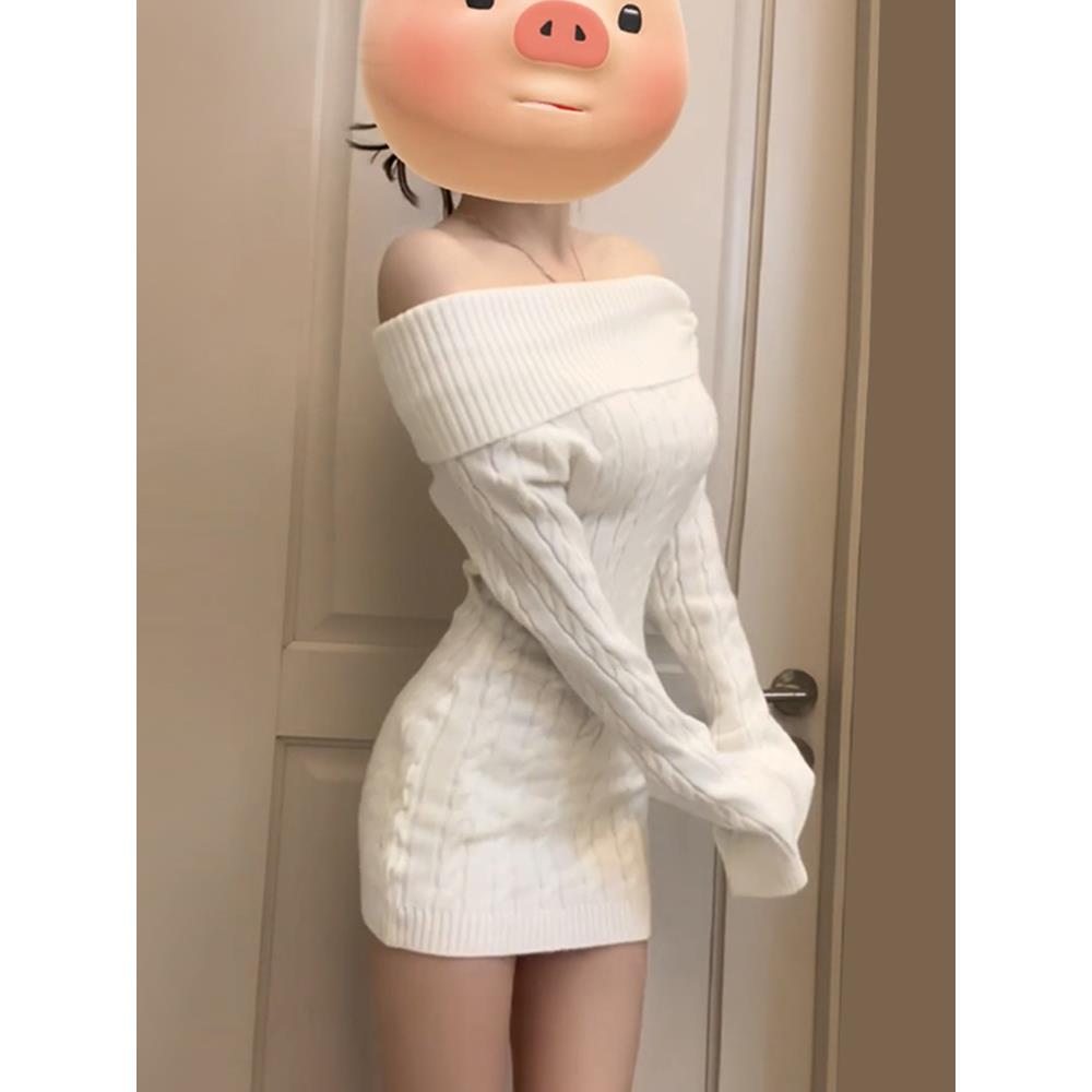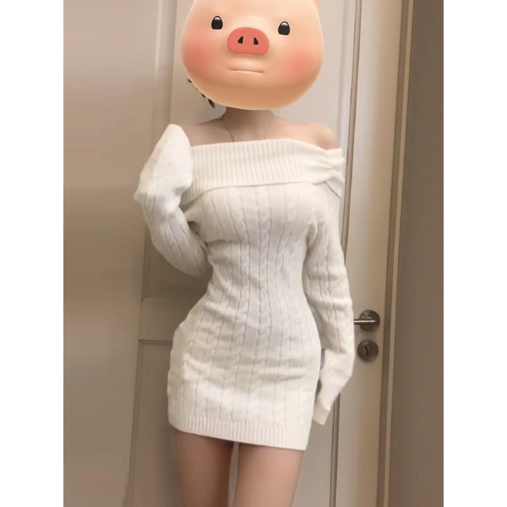 一字肩白色针织连衣裙子女早秋季2025新款配大衣内搭修身包臀短裙