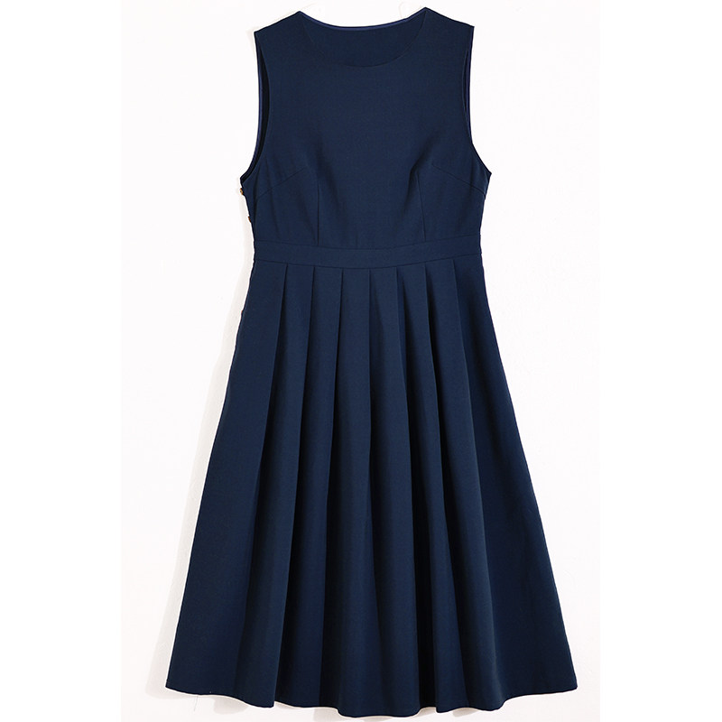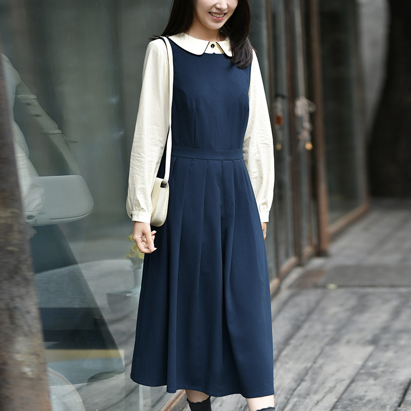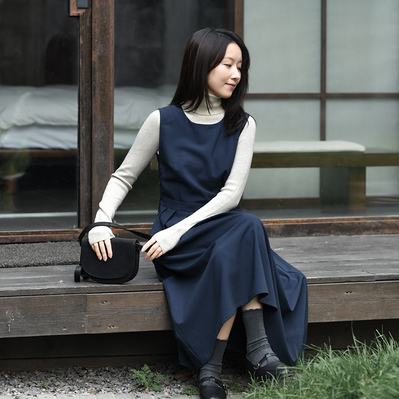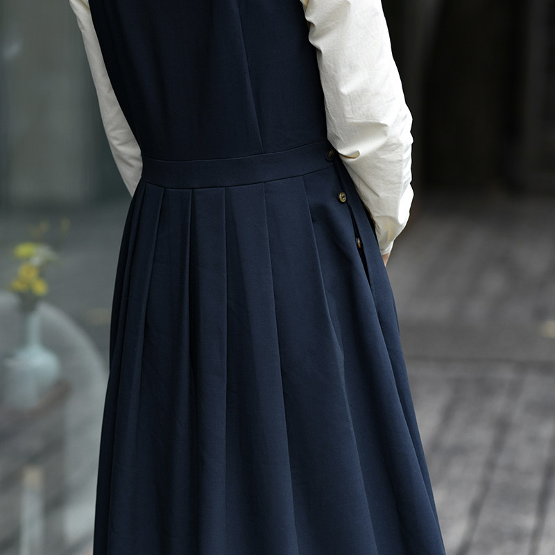 24QDC-148【蓝舟雾柳】前世今生复古简约文艺圆领压褶修身背心裙