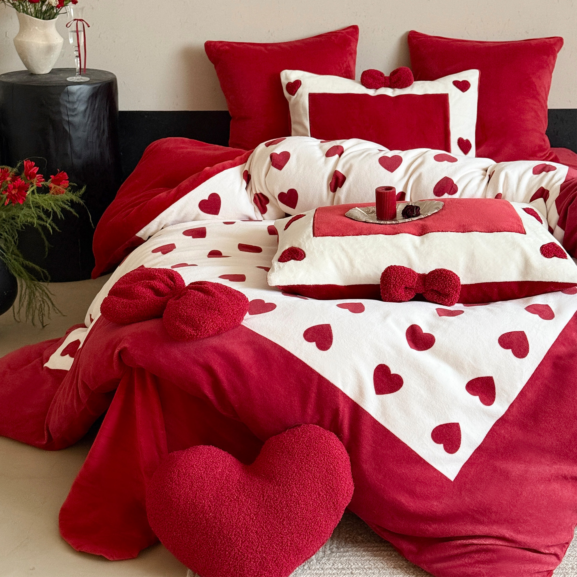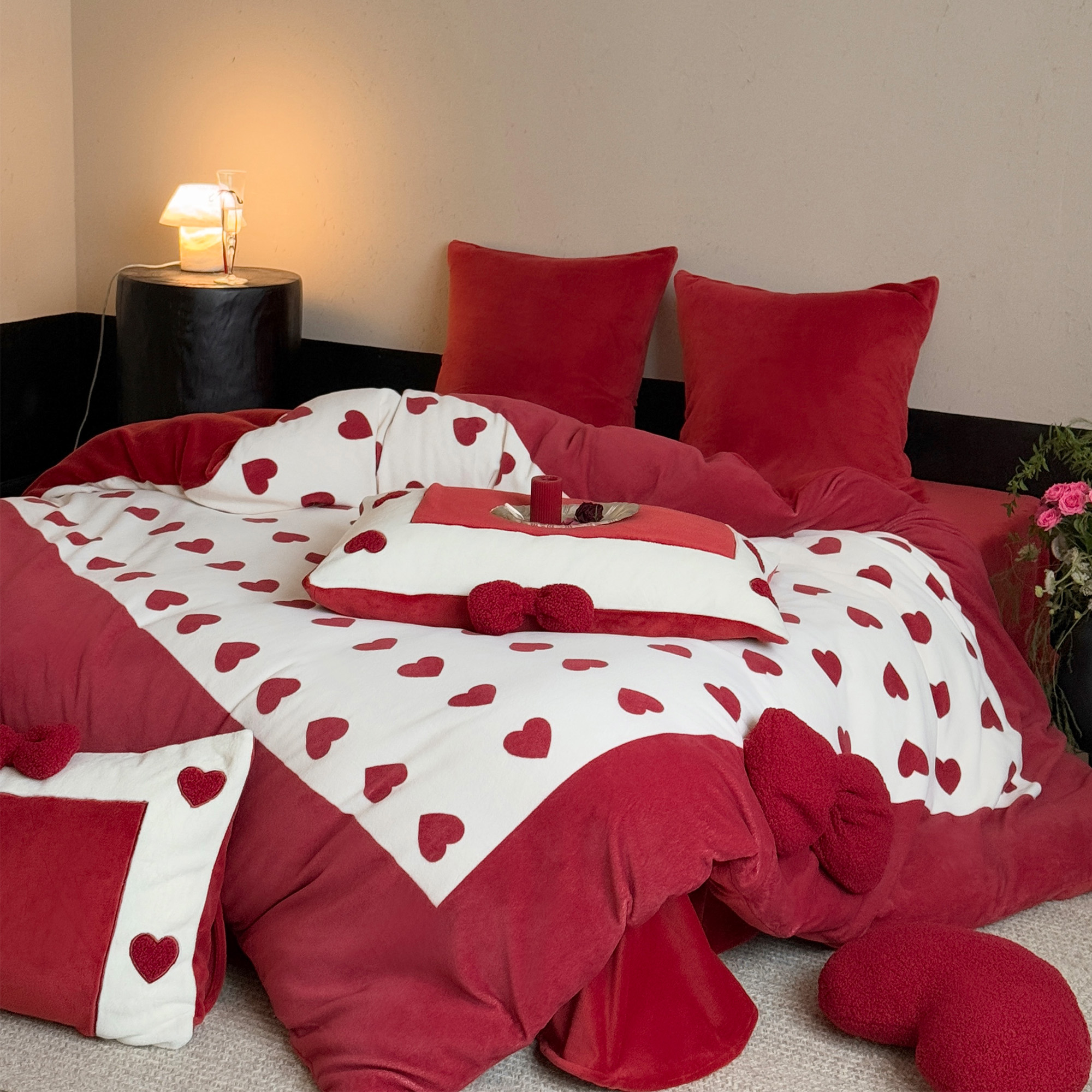 冬天保暖牛奶绒婚庆四件套红色爱心印花珊瑚绒结婚被套床单床笠