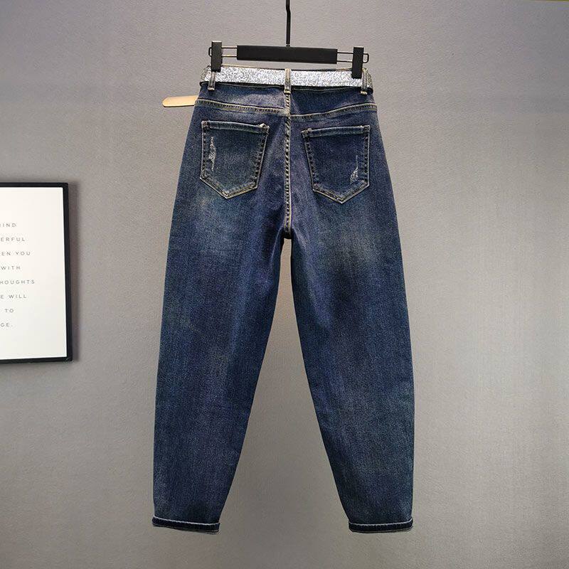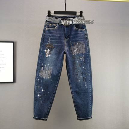 欧货重工烫钻牛仔哈伦裤女秋冬厚款宽松弹力老爹裤字母九分裤垮裤