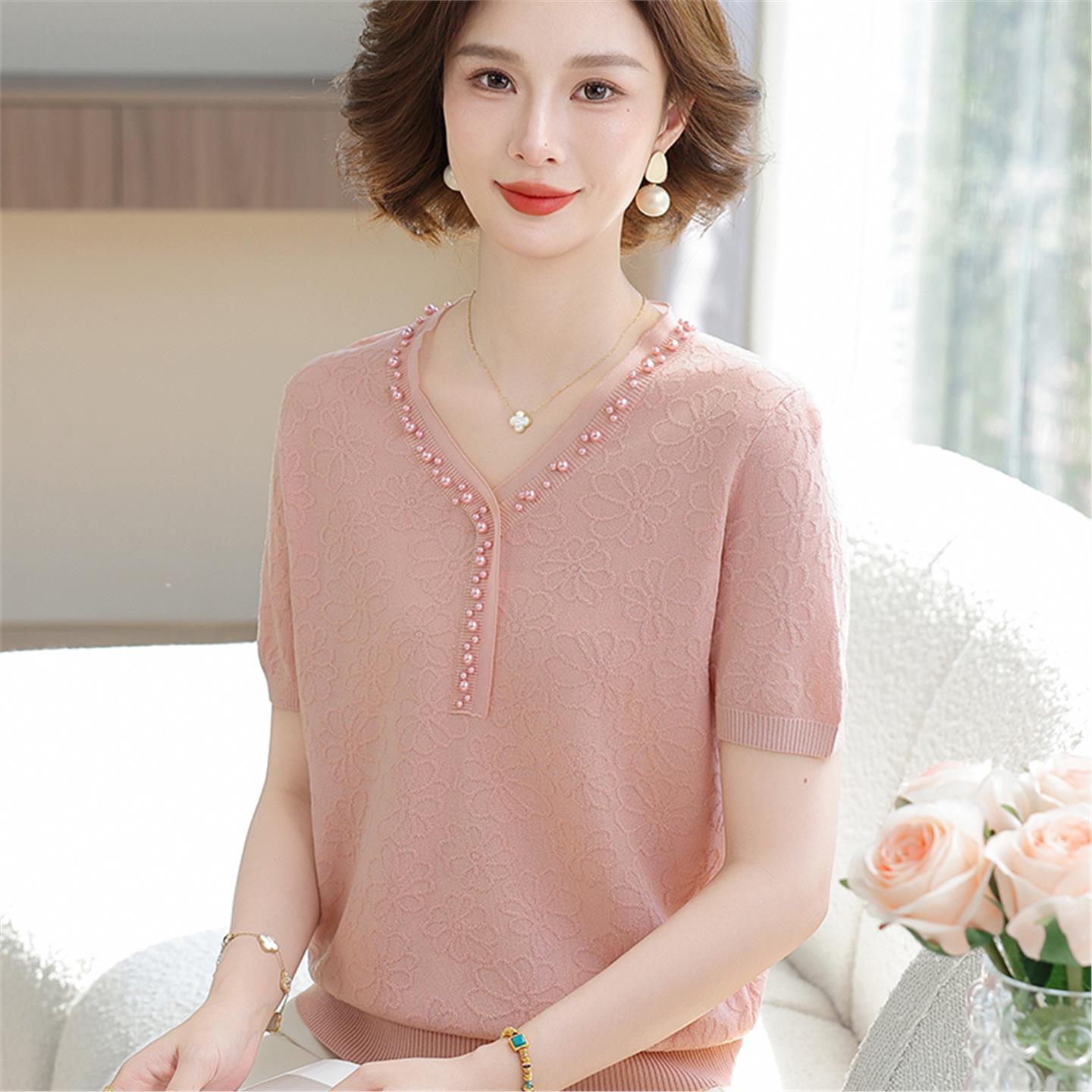 中年妈妈夏装新款冰丝小衫短袖t恤中老年女装时尚套装薄款上衣服