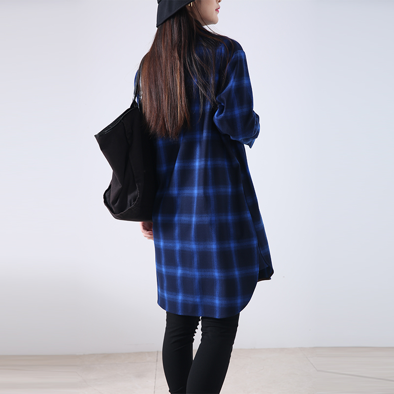 春秋新款长袖宝蓝色磨毛格子衬衫女韩版通勤中长款精致衬衣外套