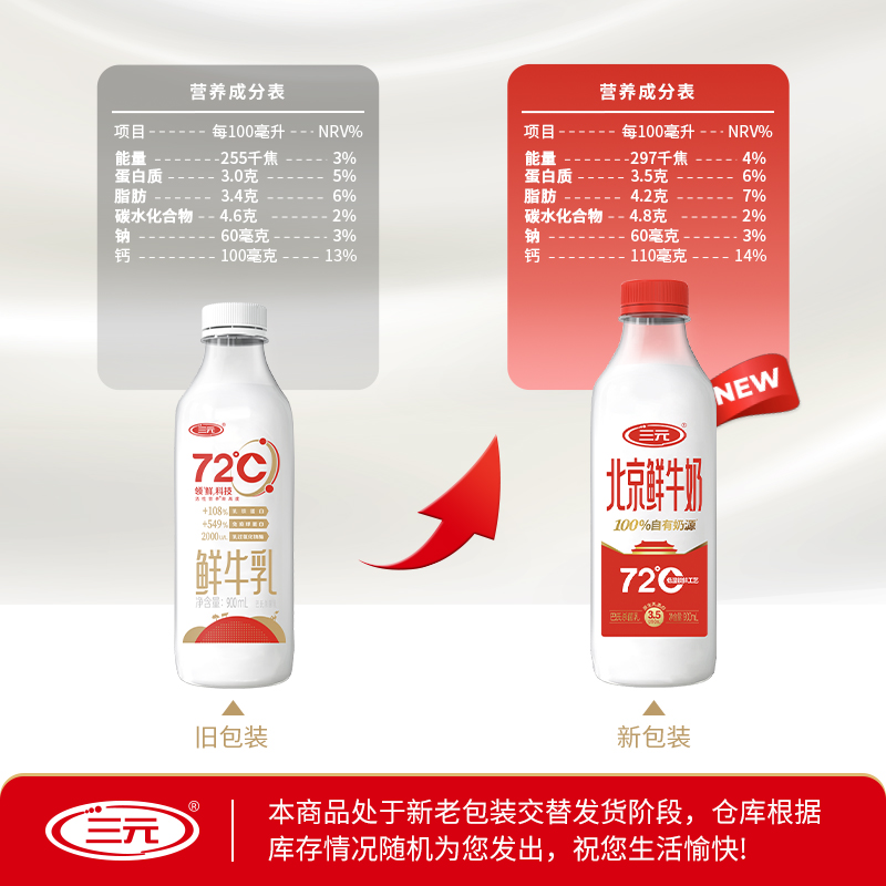 三元北京鲜牛奶72度900ml*2瓶装低温纯牛奶营养早餐低温冷藏牛奶