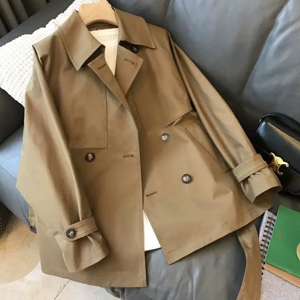 深圳南油女装~细节做到J致!双排扣宽松系带收腰短款风衣外套女
