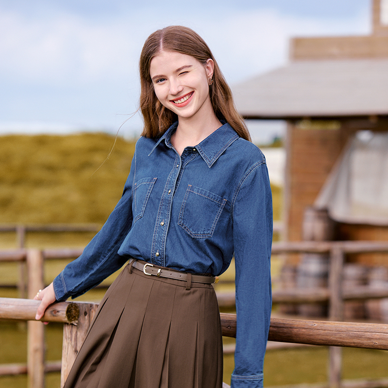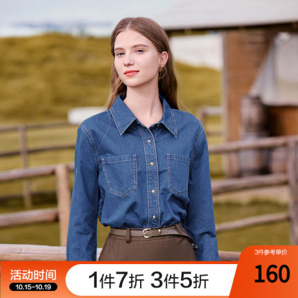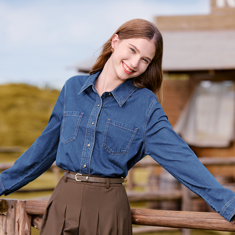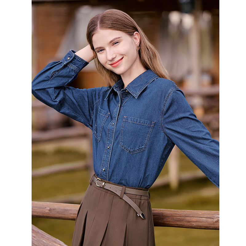 betu百图复古深蓝色牛仔衬衫女长袖2024年秋季新款纯棉衬衣