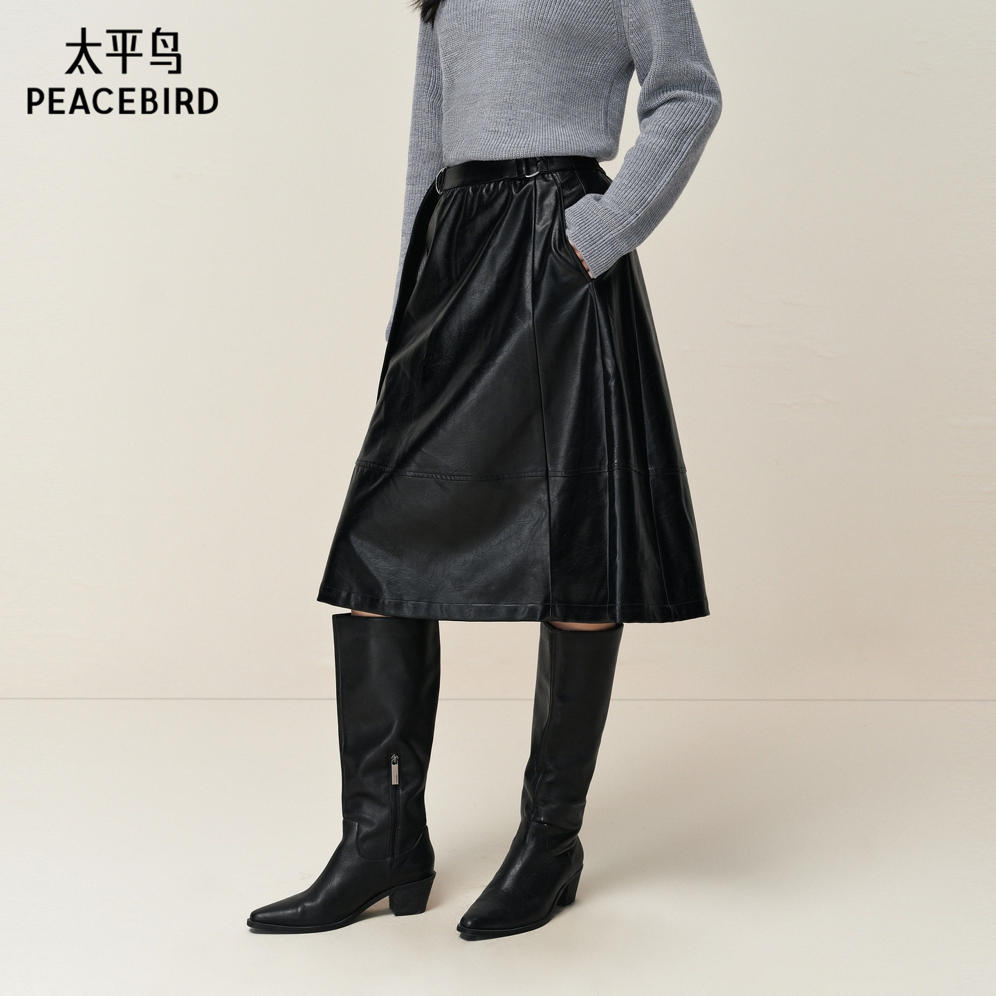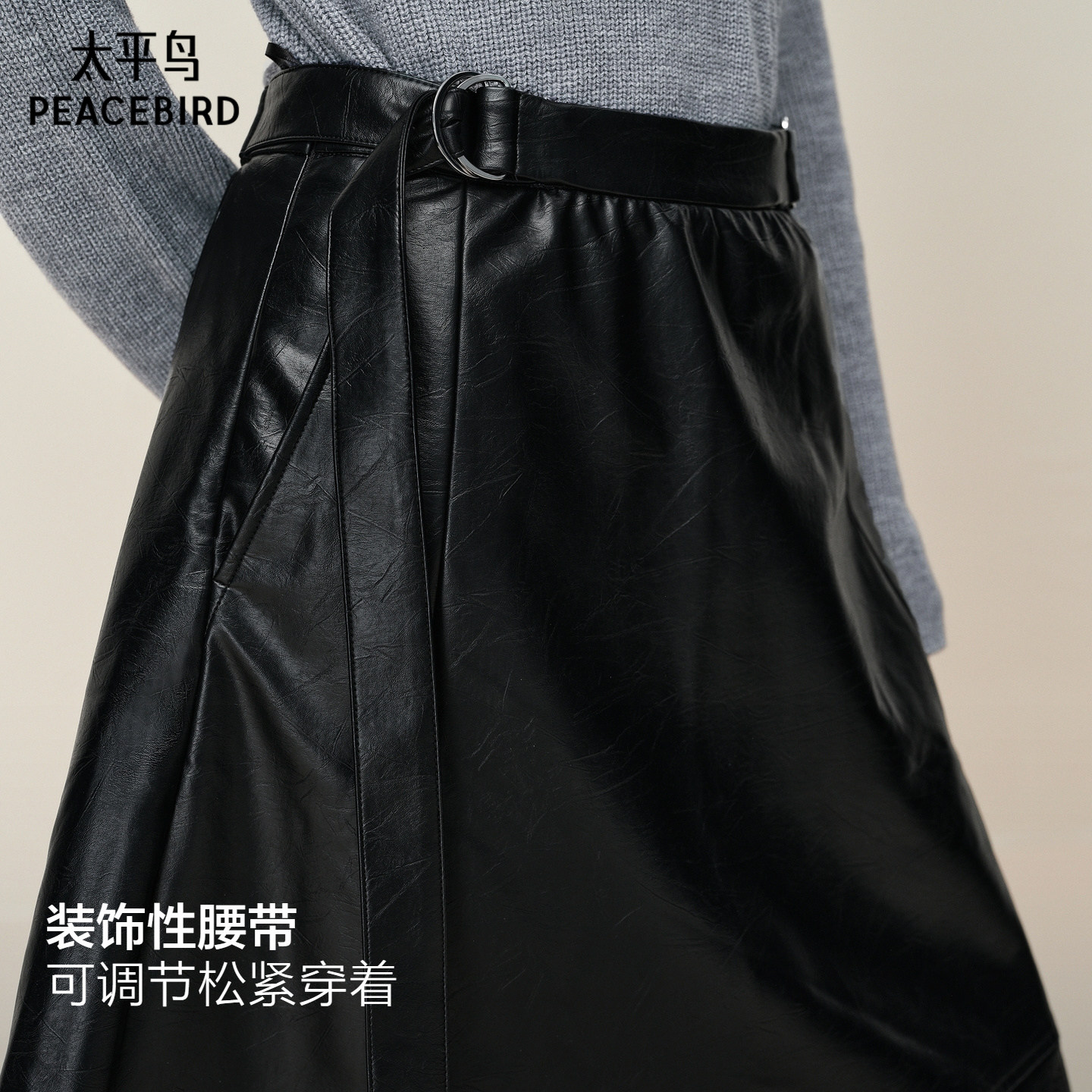 【商场同款】太平鸟高腰A字伞裙棕色PU皮半身裙短裙A3GFF4B06