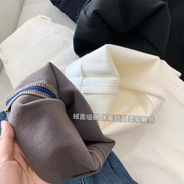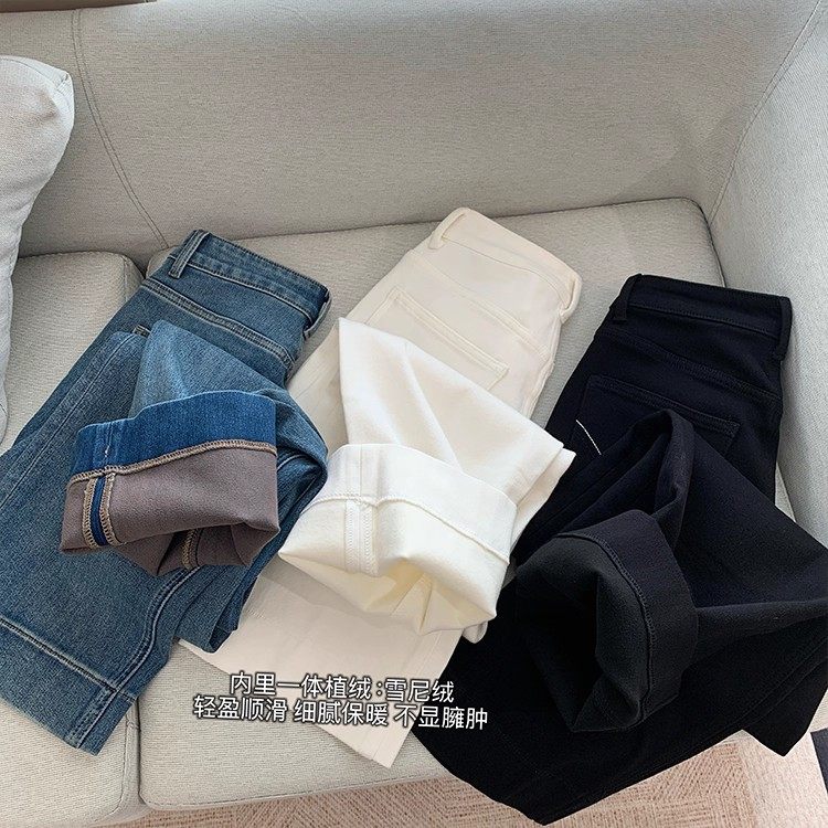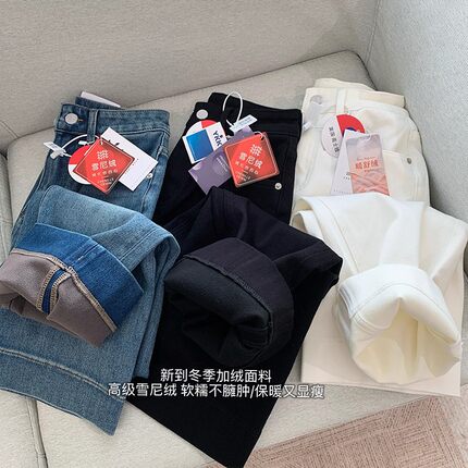 四面弹加绒直筒牛仔裤九分小个子
