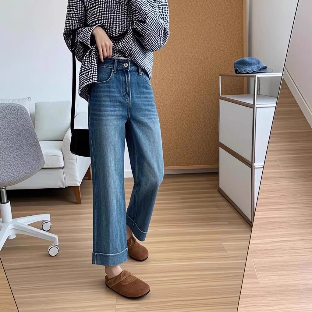 四面弹高腰加绒九分直筒裤女秋冬季宽松显瘦窄版阔腿牛仔裤小个子