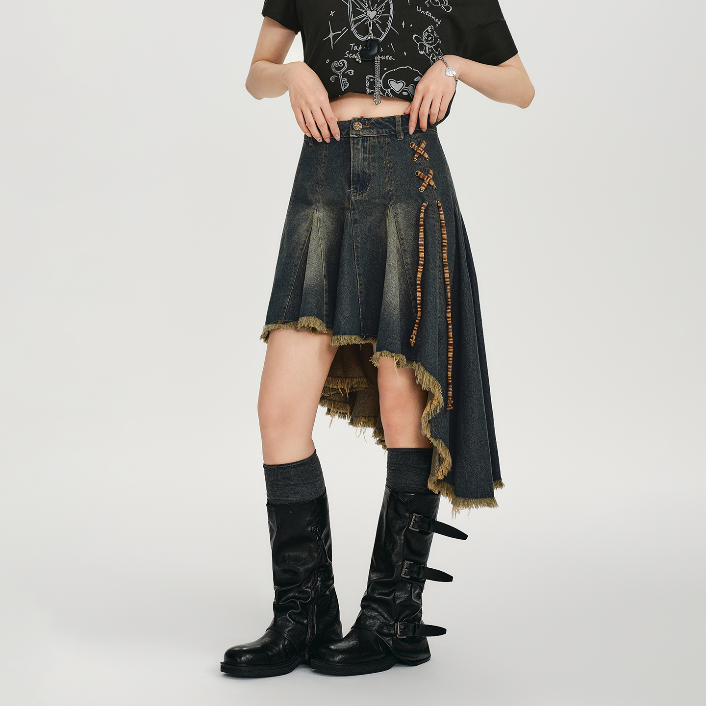 Girlyhalo美式复古水洗做旧秋冬新款不规则流苏边系带牛仔半身裙