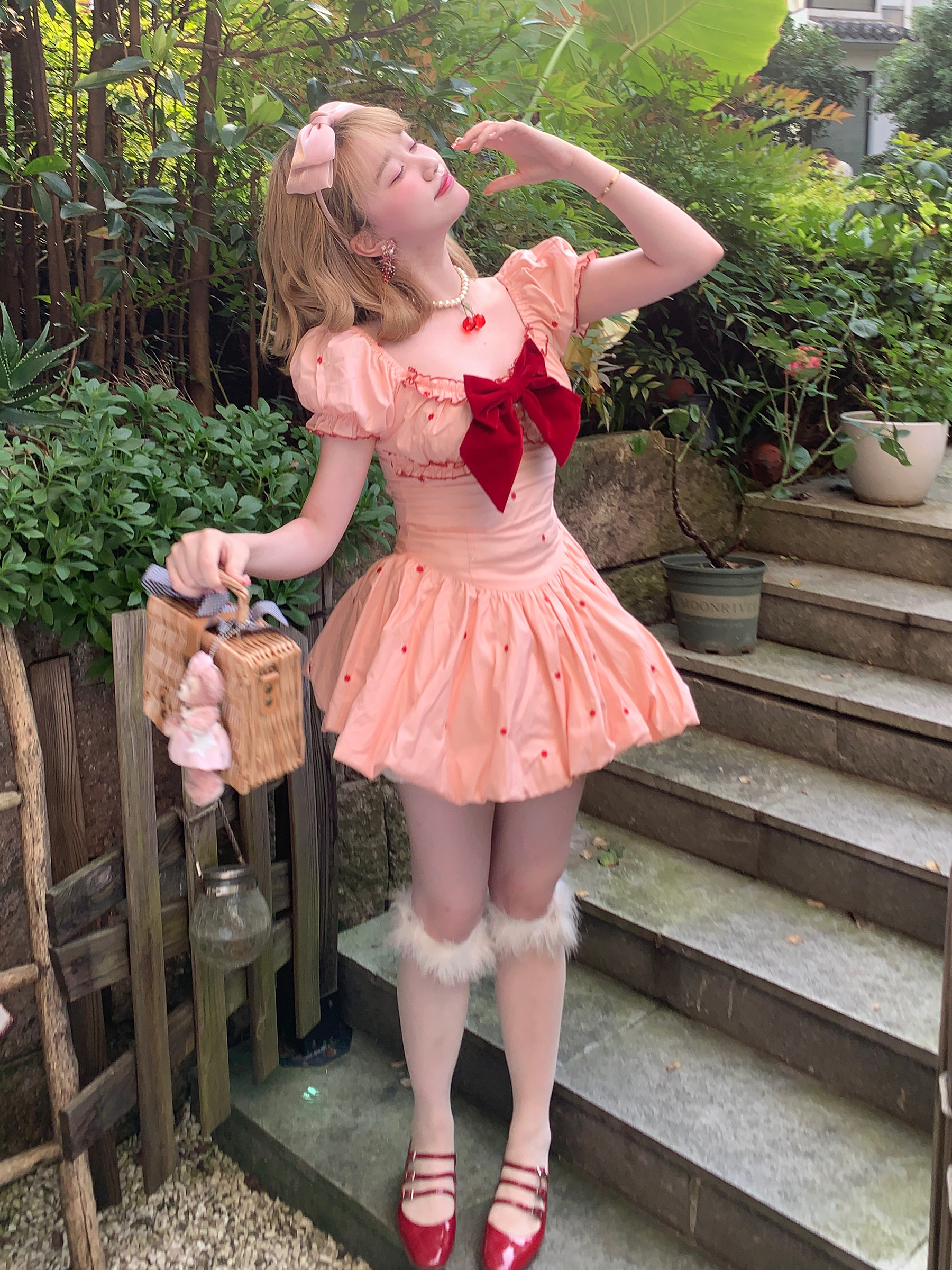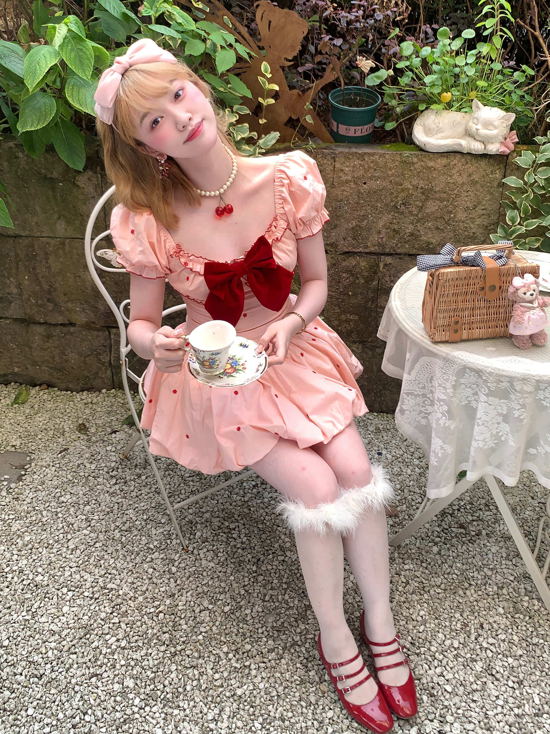 森女系原创想去海边 小花心 粉红色可爱小花朵刺绣软妹短袖连衣裙