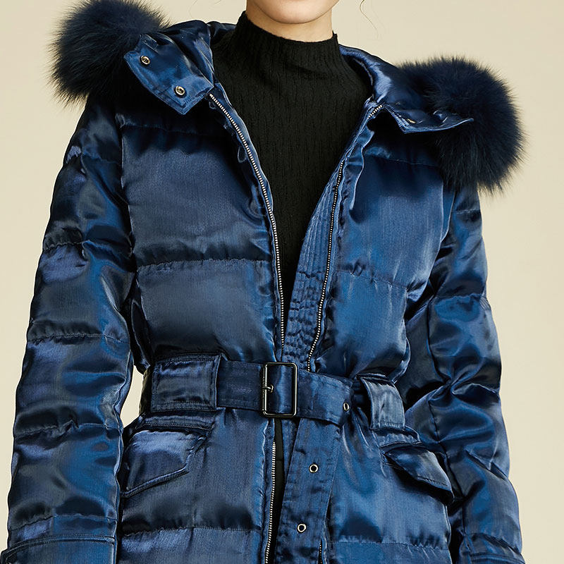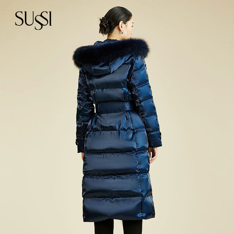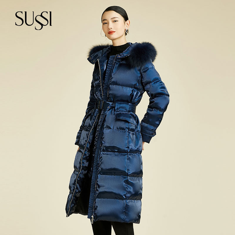 SUSSI/古色冬季新品商场同款宝蓝色连帽前中拉链系带长款羽绒服