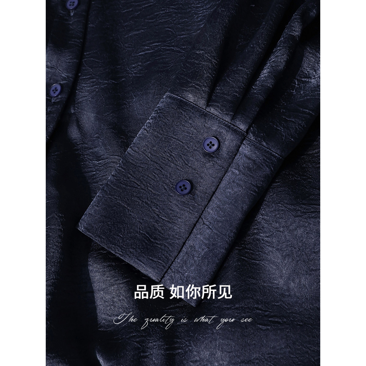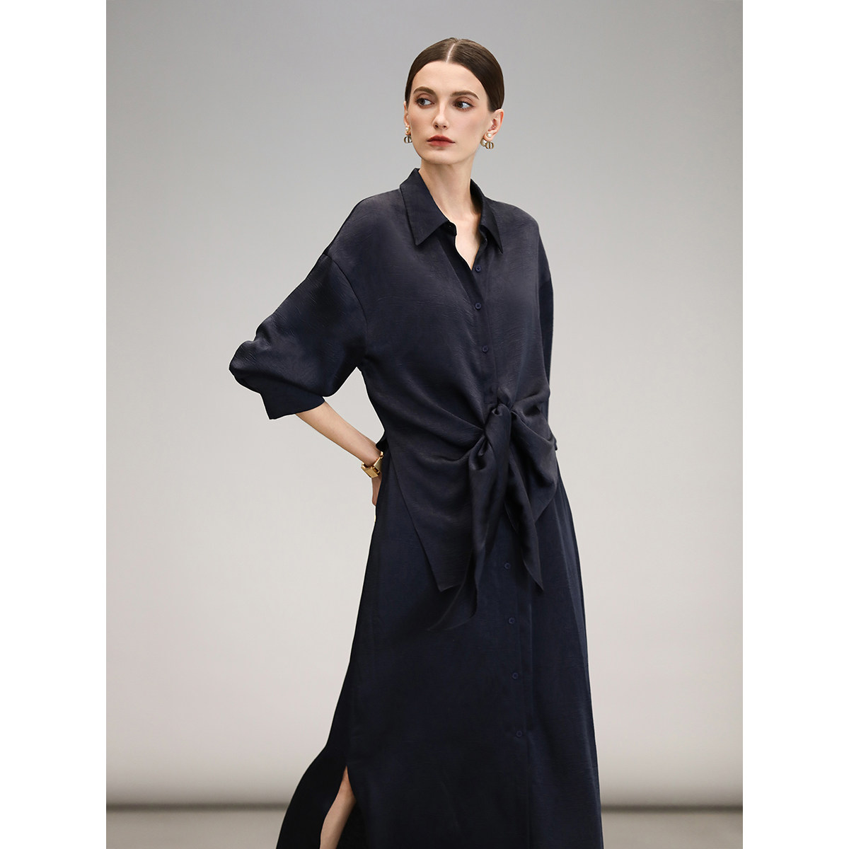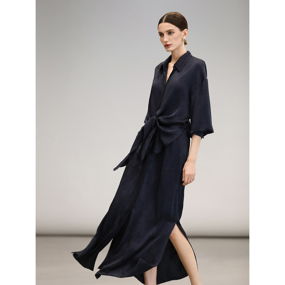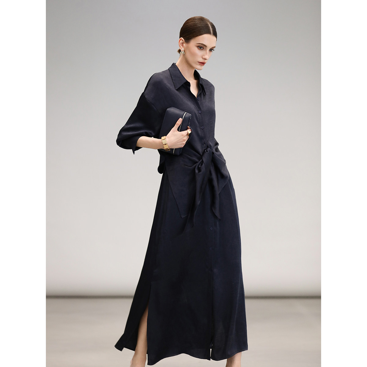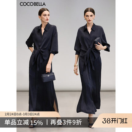 COCOBELLA光泽感缎面大摆衬衫领连衣裙女假两件长款衬衫裙FR3009