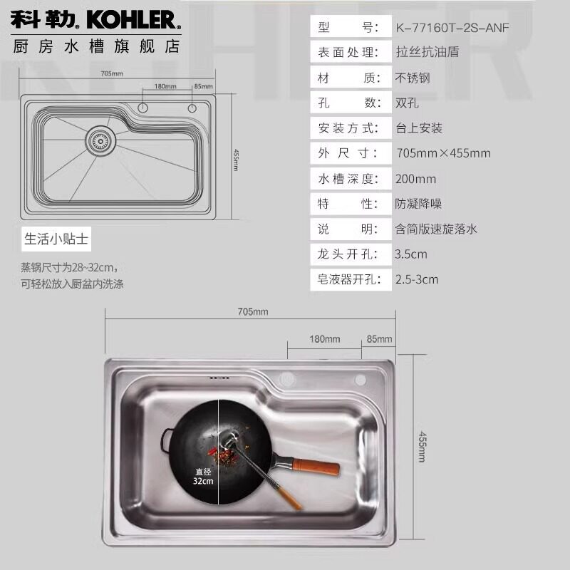 科勒不锈钢台上台下大单槽77160T