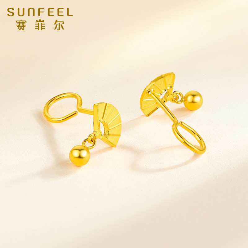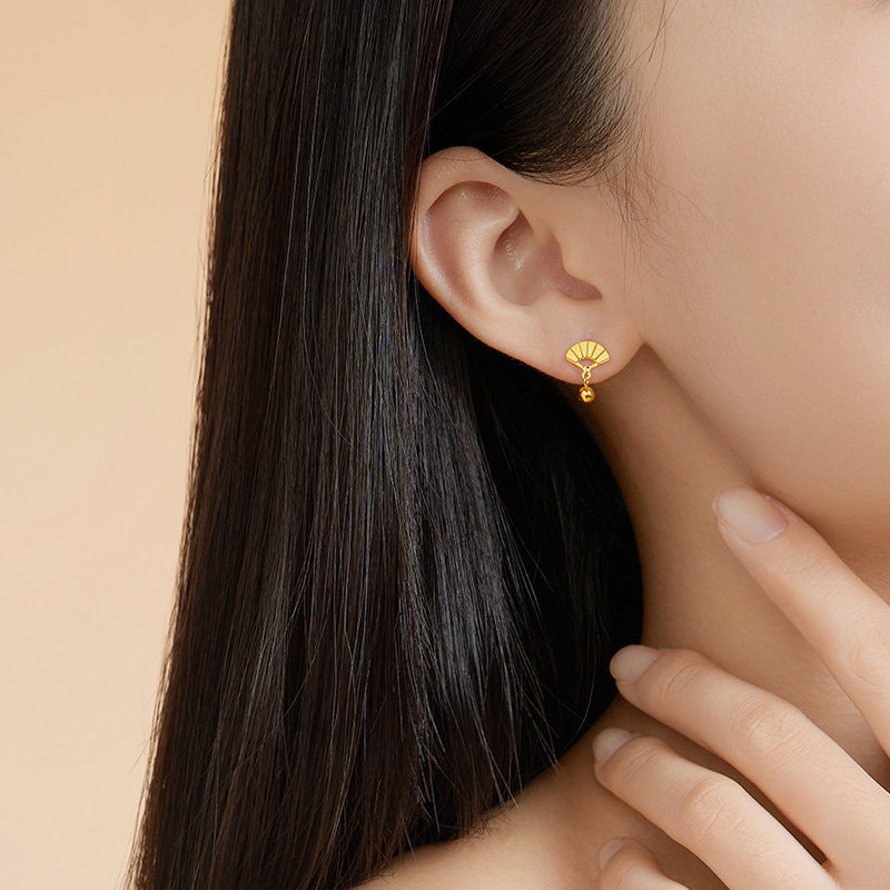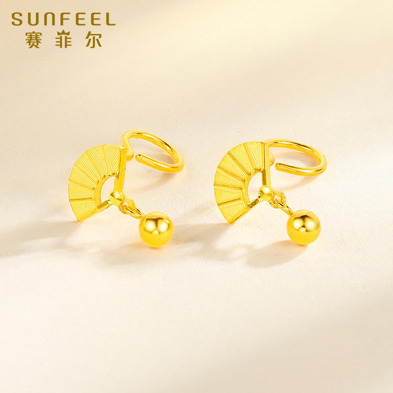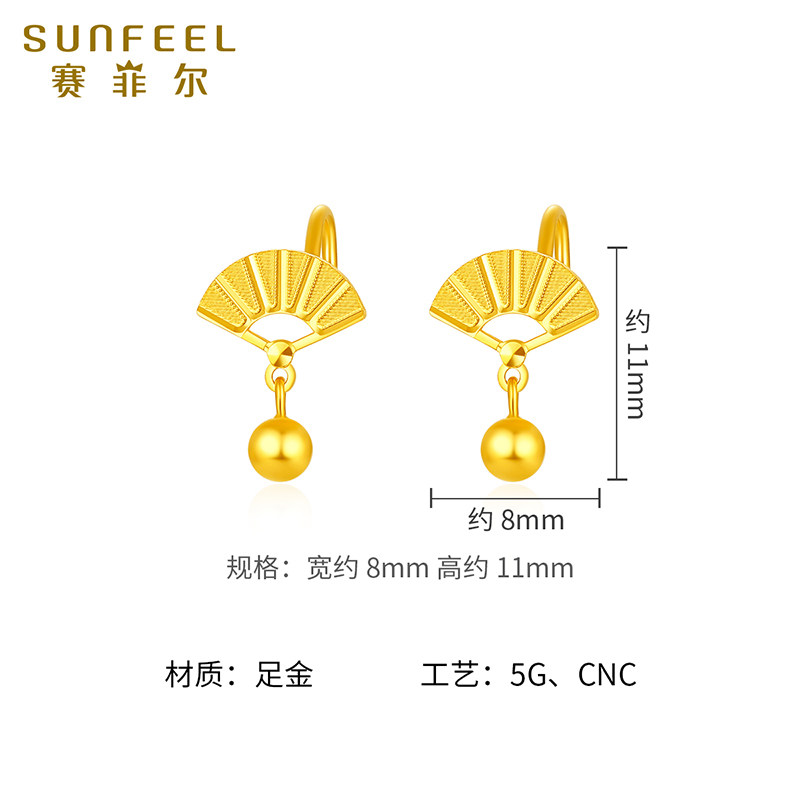 赛菲尔黄金耳饰足金扇子耳钉5G黄金耳坠小金珠耳吊送女友生日礼物