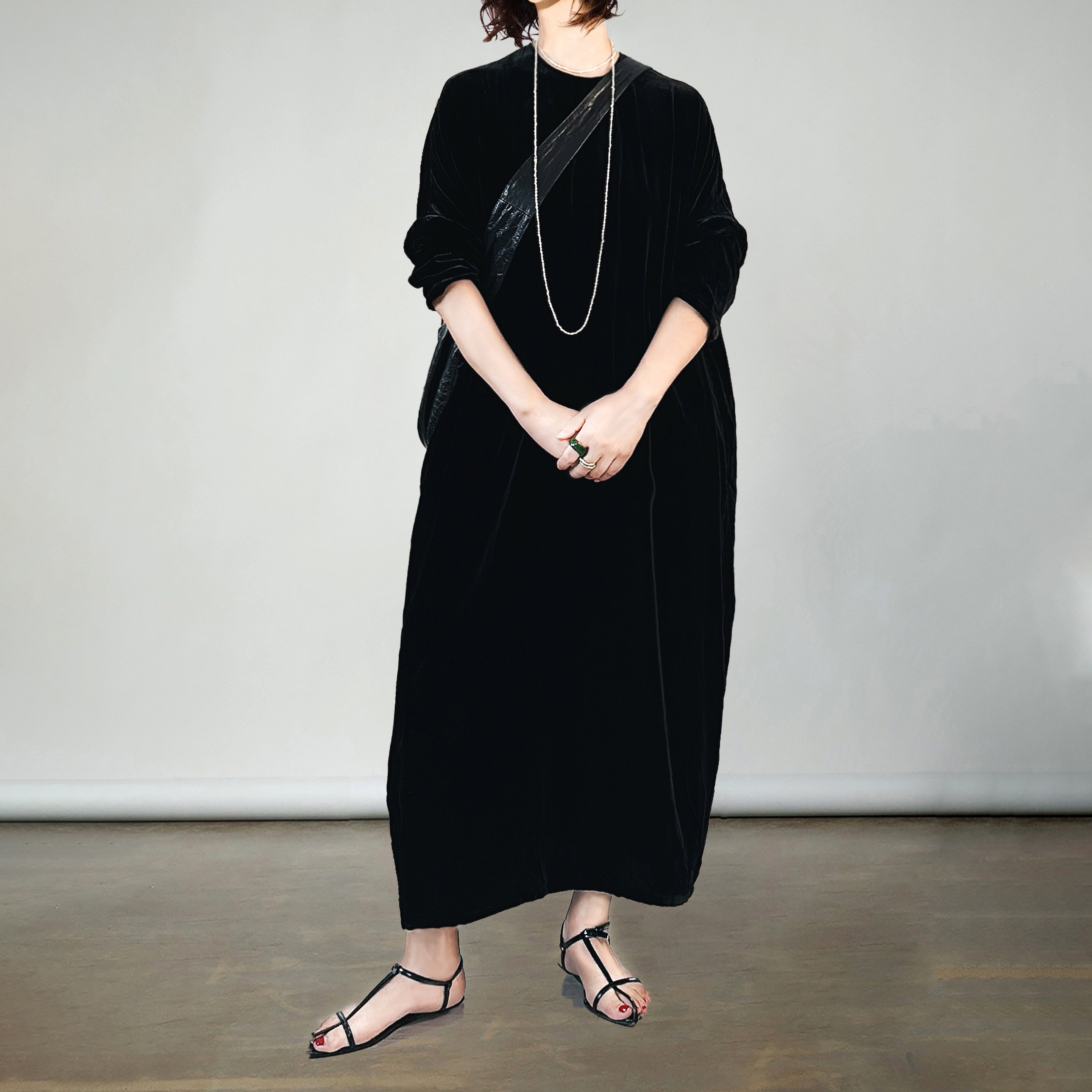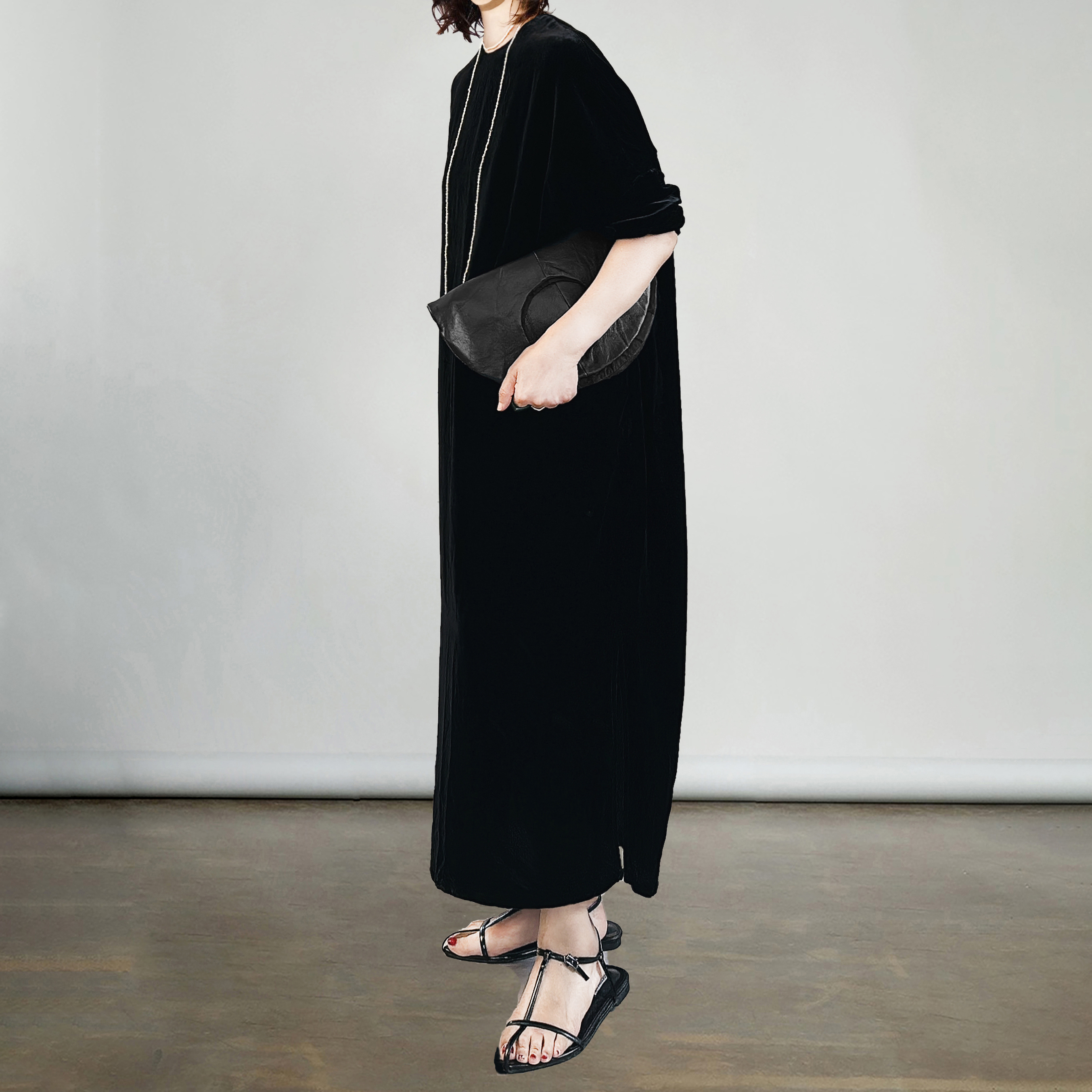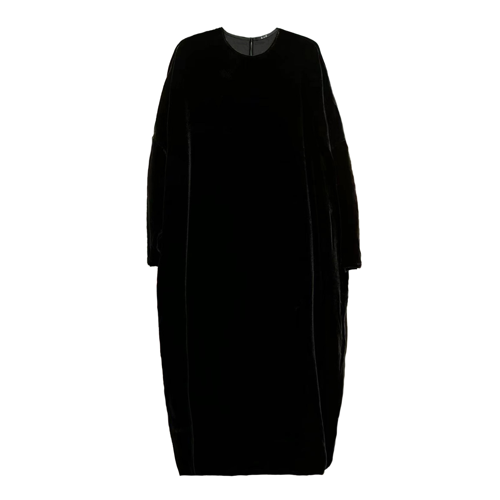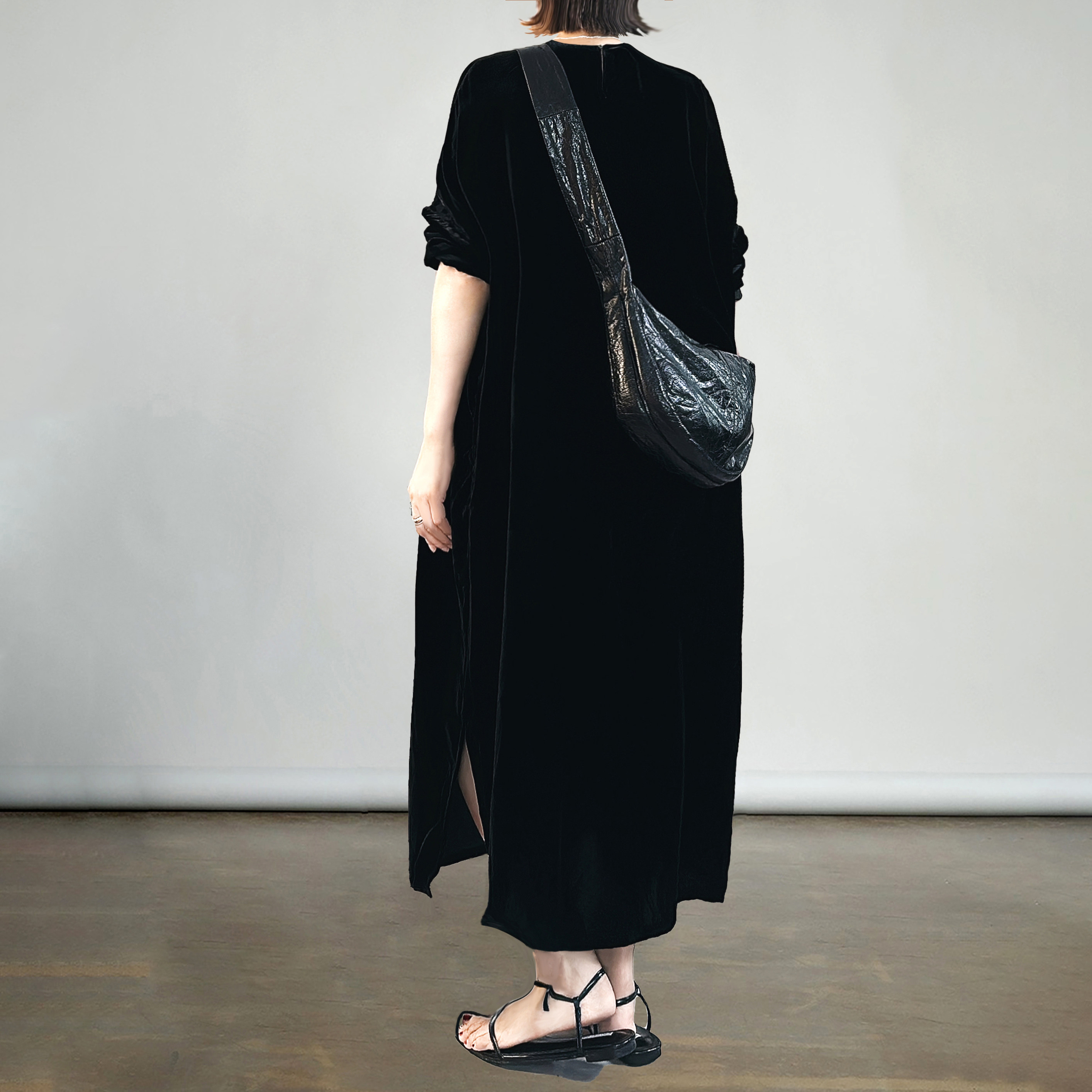 黑色秋季款真丝绒圆领宽松连衣裙