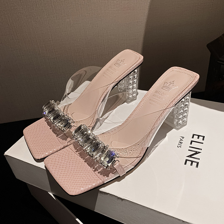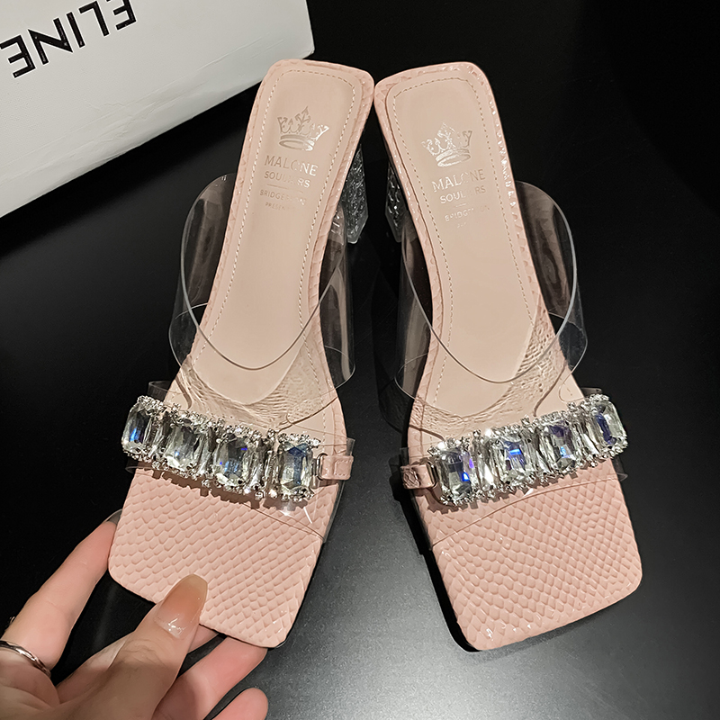 欧洲站水钻透明凉拖鞋女2025夏新款水晶粗跟方头高跟鞋真皮一字拖