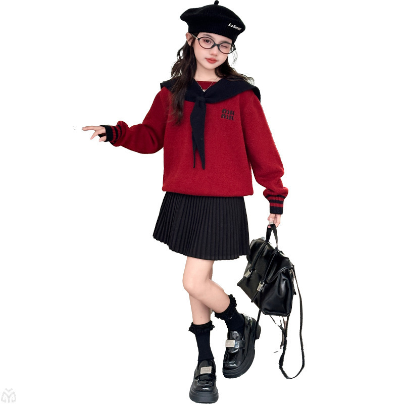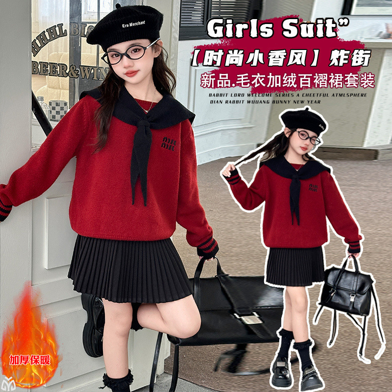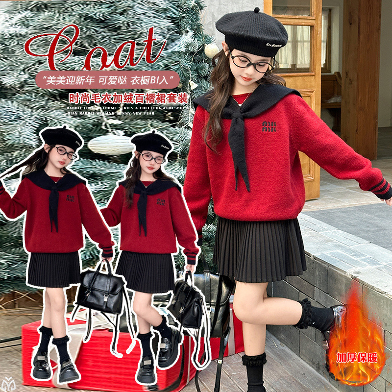 女童秋冬套装裙子2025新款连衣裙儿童装冬季女孩新年红色大童毛衣