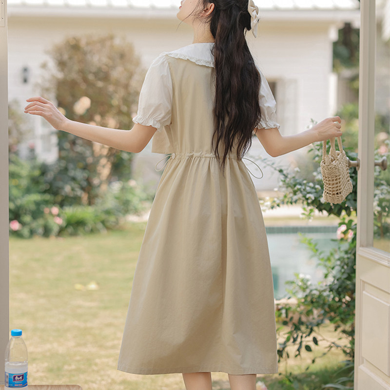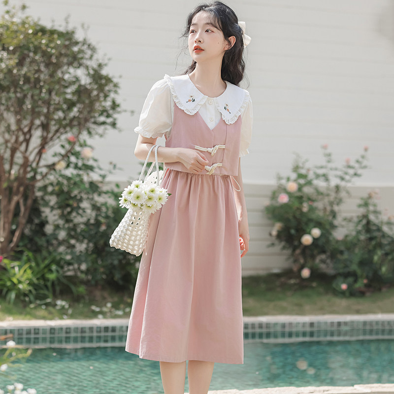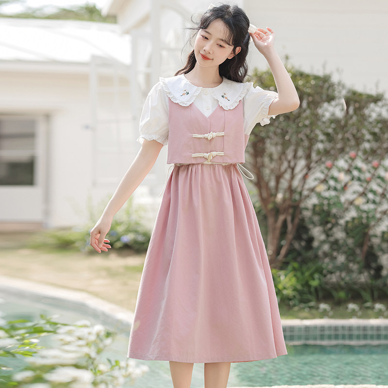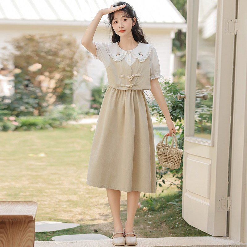 少女新中式牛角扣连衣裙2024夏季新款初中高中学生假两件气质长裙