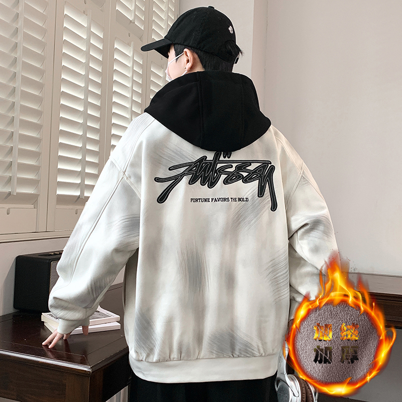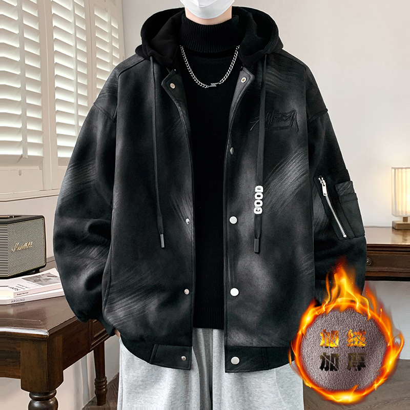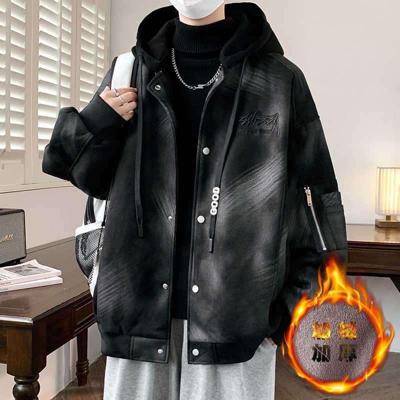 可脱卸帽外套冬季加绒加厚假两件夹克男款宽松帅气装保暖棉服以純