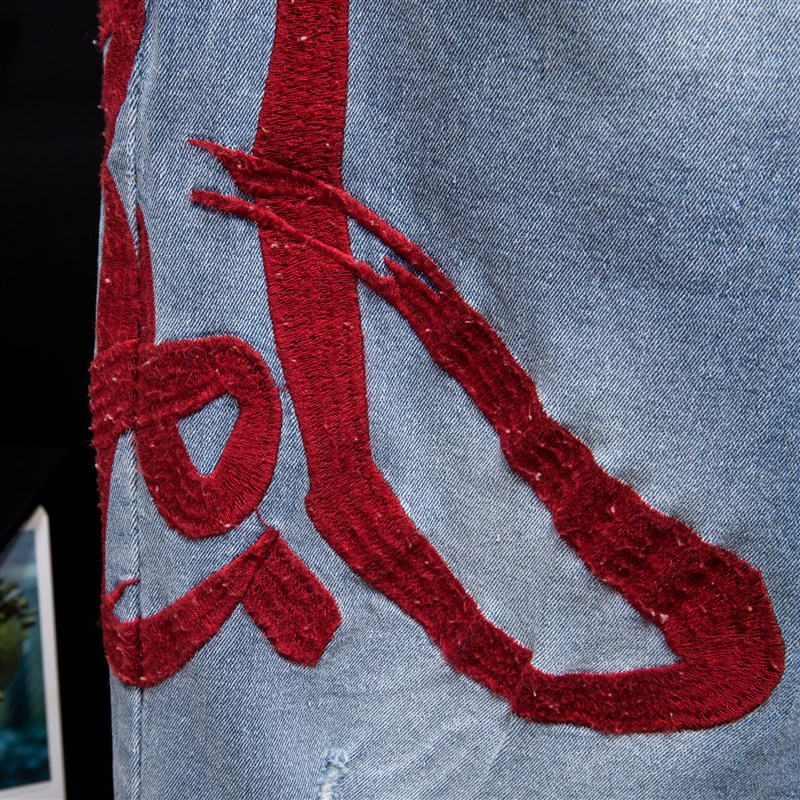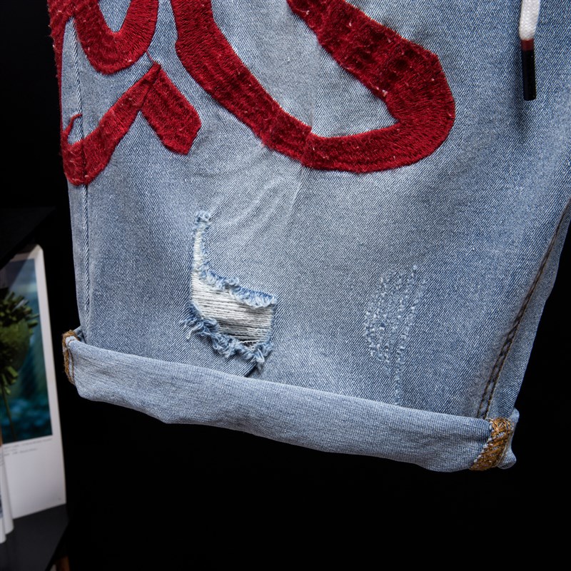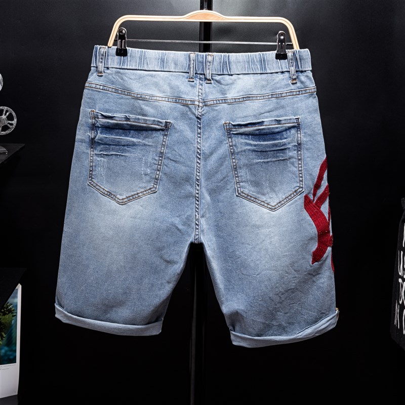 胖子风字刺绣潮牌大码牛仔短裤男装弹力松紧腰五分裤加肥加大中裤