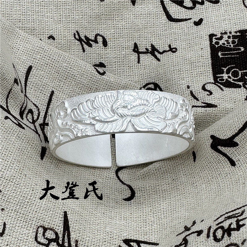 女士银手镯 足银999牡丹花开富贵雪花银开口饰品宽面银手环
